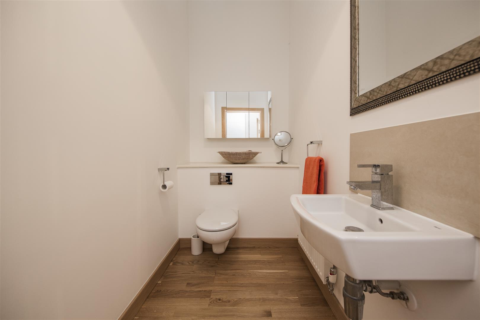 A well-appointed WC with contemporary fixtures, including a wall-mounted WC and a wash basin. The room is finished with wood-effect flooring and subtle neutral wall colours, offering a clean and practical space for guests.