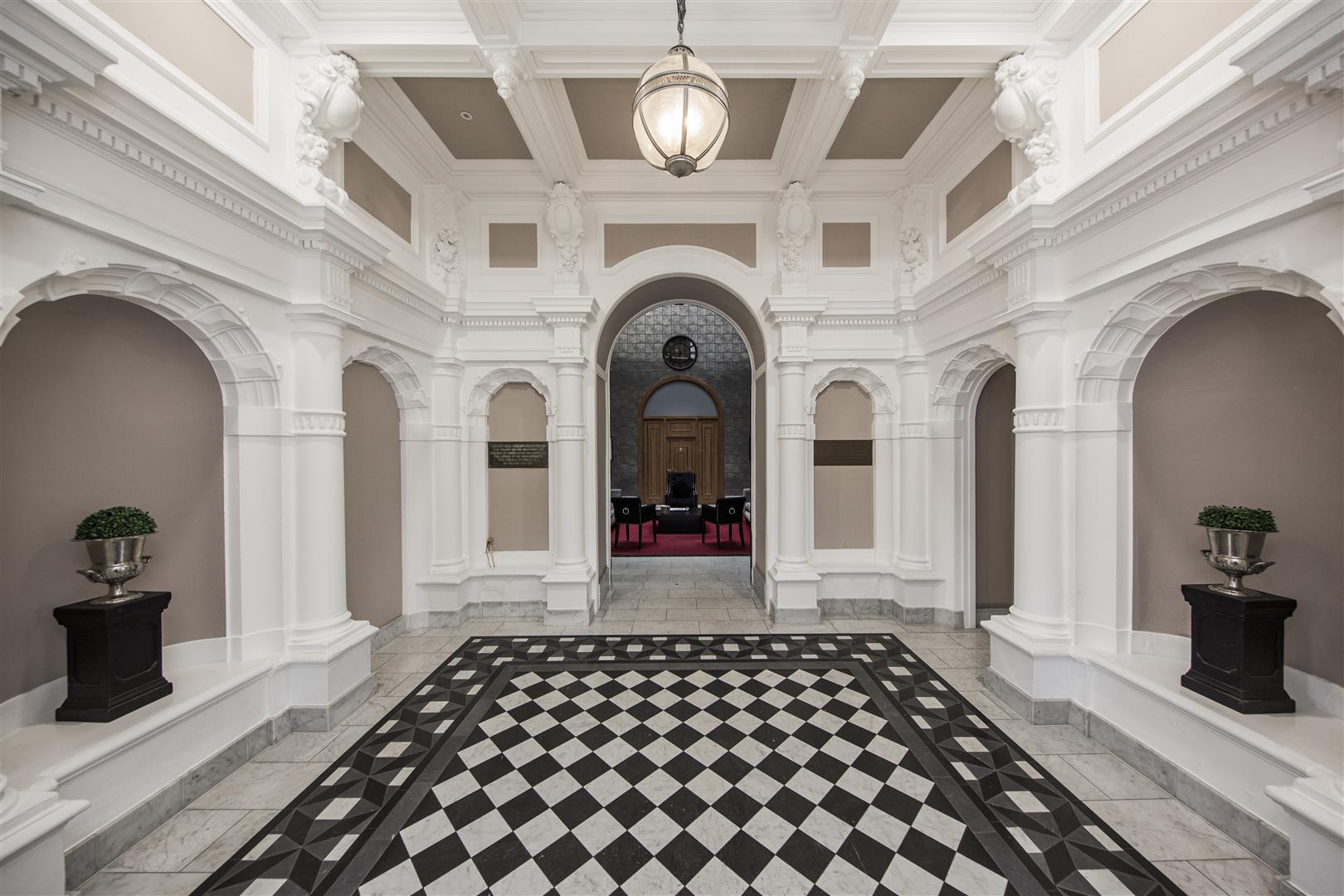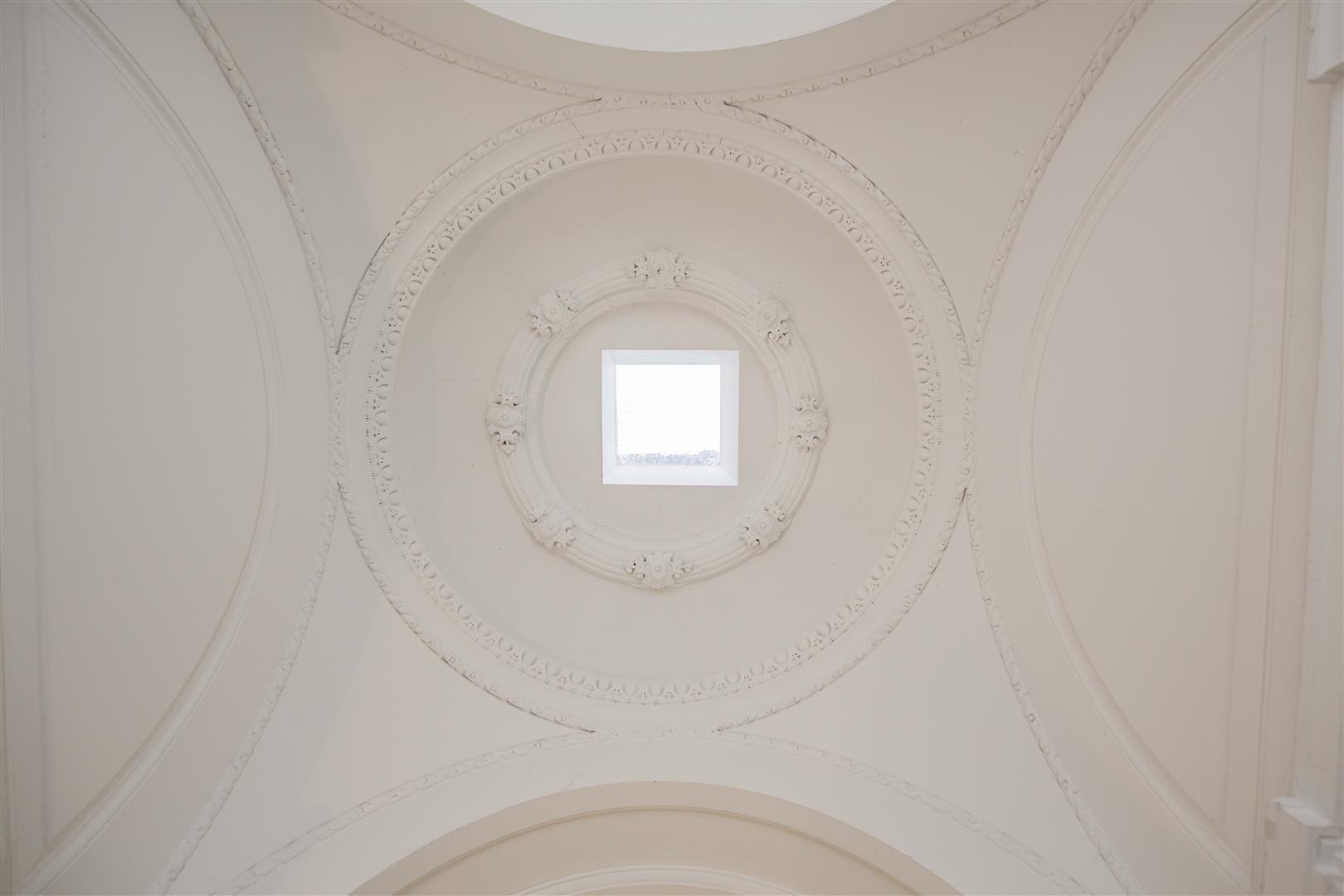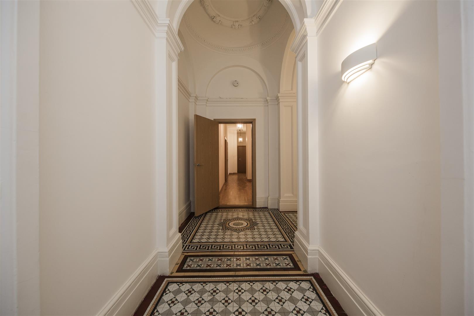 This impressive entrance hall welcomes you with its soaring ceilings and intricate mouldings, creating an immediate sense of grandeur. The floor features a beautiful patterned mosaic mintern tile design that lends a classic touch to the space. Soft wall lighting enhances the architectural details and highlights the elegant archways, setting a refined tone for the rest of the home. This in turn opens into more modern space offering up access to all areas.