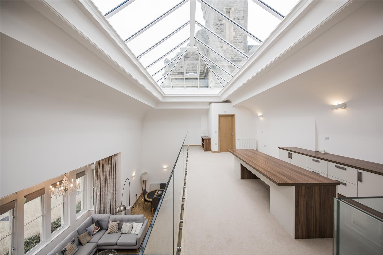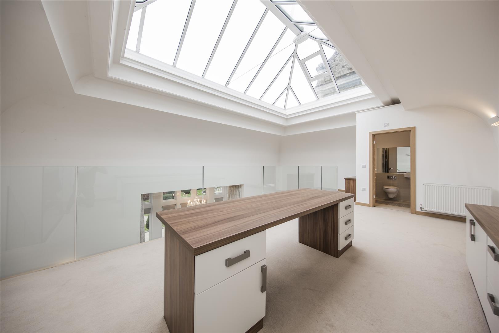 The mezzanine floor offers a versatile office or bedroom space, featuring a large lantern skylight that brings in plenty of natural light and glass balustrades that overlook the living area below. This room is carpeted for comfort and includes built-in storage along one wall. An ensuite bathroom with modern fittings and a bath completes this private space, making it ideal for working or relaxing in comfort and style.