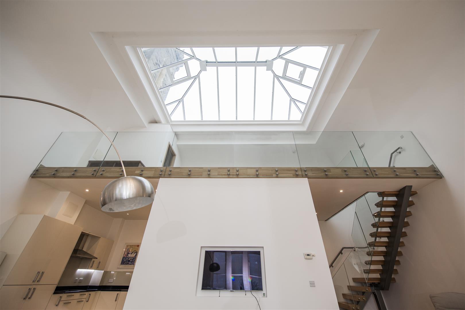 The open-plan kitchen, dining, and sitting room is a stunning, light-filled space with high ceilings and a large lantern skylight that floods the room with natural light. The room features wooden flooring throughout and a modern, neutral colour scheme that feels fresh and inviting. The sitting area is arranged around a contemporary media wall with a large TV, creating a perfect spot to relax. Adjacent to this, the dining area comfortably accommodates a large table for family and friends, with the kitchen boasting sleek, glossy cabinets, integrated appliances, and under-cabinet lighting that adds a modern flair. A staircase with glass balustrades leads to a mezzanine level, enhancing the airy, open feel of this versatile living space.