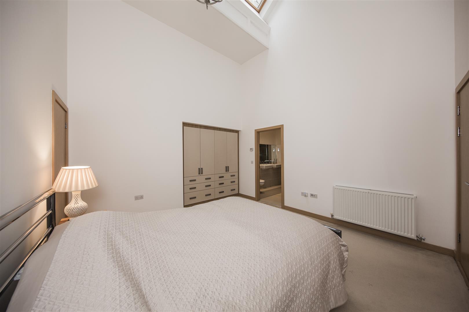 This spacious bedroom is carpeted and features high ceilings with a simple cornice detail. It is furnished with a double bed and built-in wardrobes with ample storage. The neutral, calming decor creates a peaceful atmosphere. The adjoining en suite bathroom is finished with contemporary tiling, a walk-in shower, and modern sanitary ware, offering a private sanctuary within the home.