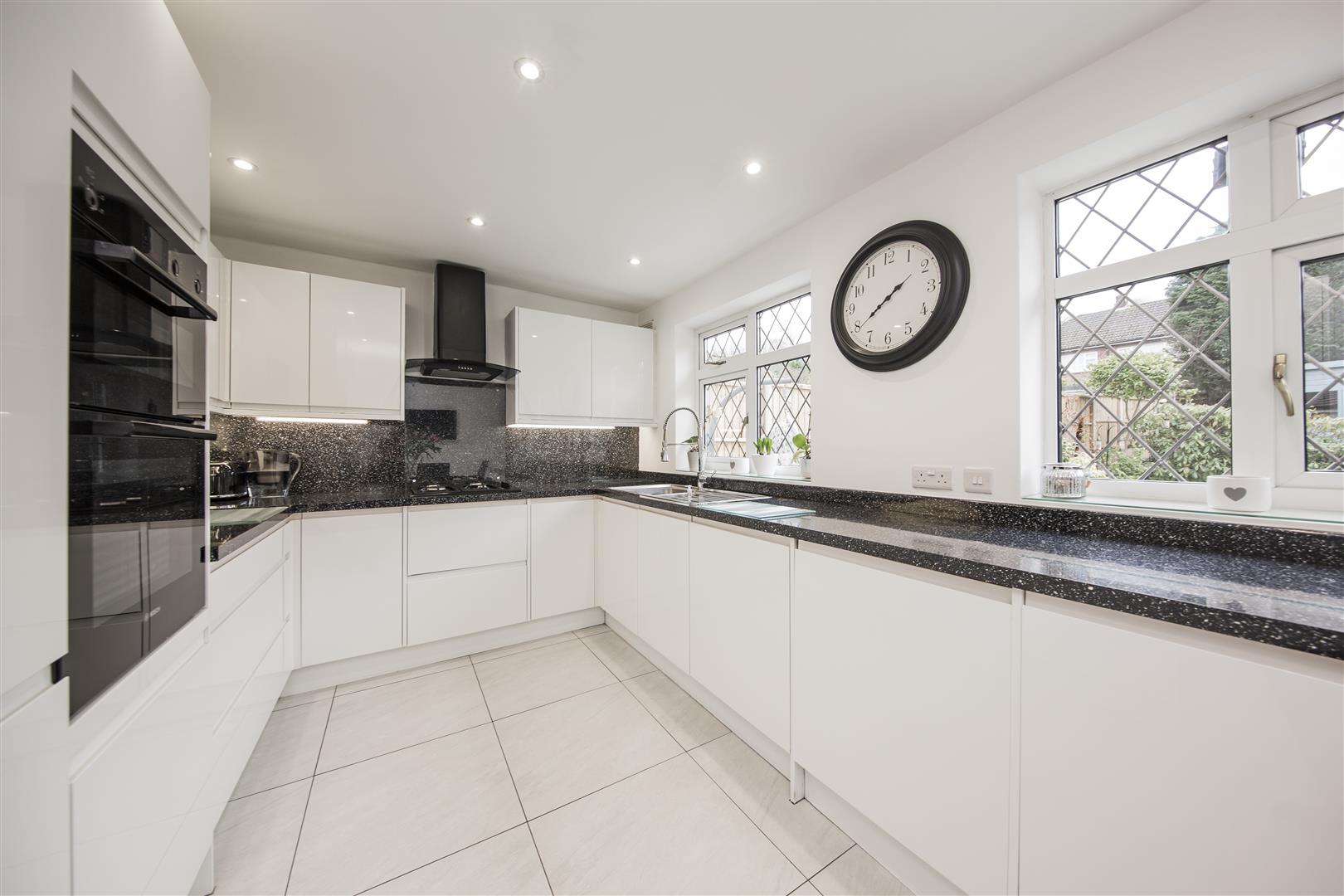 The extended rear of the house offers a bright and spacious kitchen dining area with a modern white kitchen with black worksurfaces and accents. Double aspect windows to side and rear light the space as well as a door to the South facing garden. Plenty of storage space on the link through to the room give space for utilities.