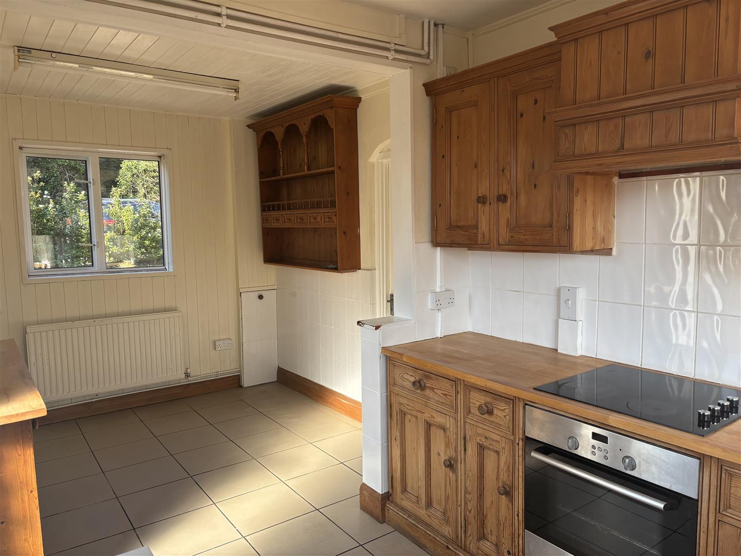 With double glazed window, double glazed door to the side, single drainer single bowl stainless steel sink unit, eclectic hob, oven and extractor. Base and wall units and tiled flooring, Oil boiler.