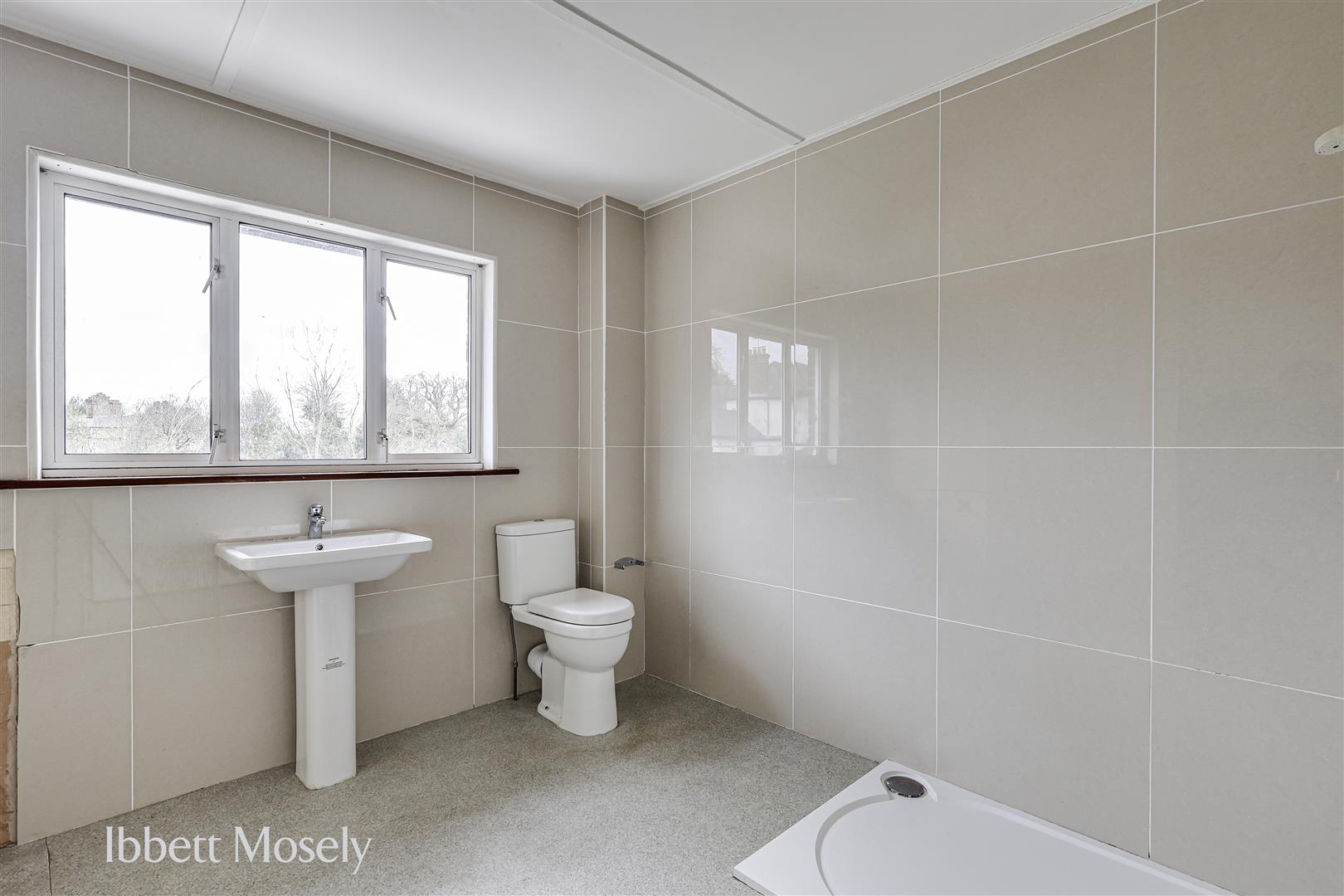 With shower tray, WC and hand basin. Tiled walls and double glazed window.
