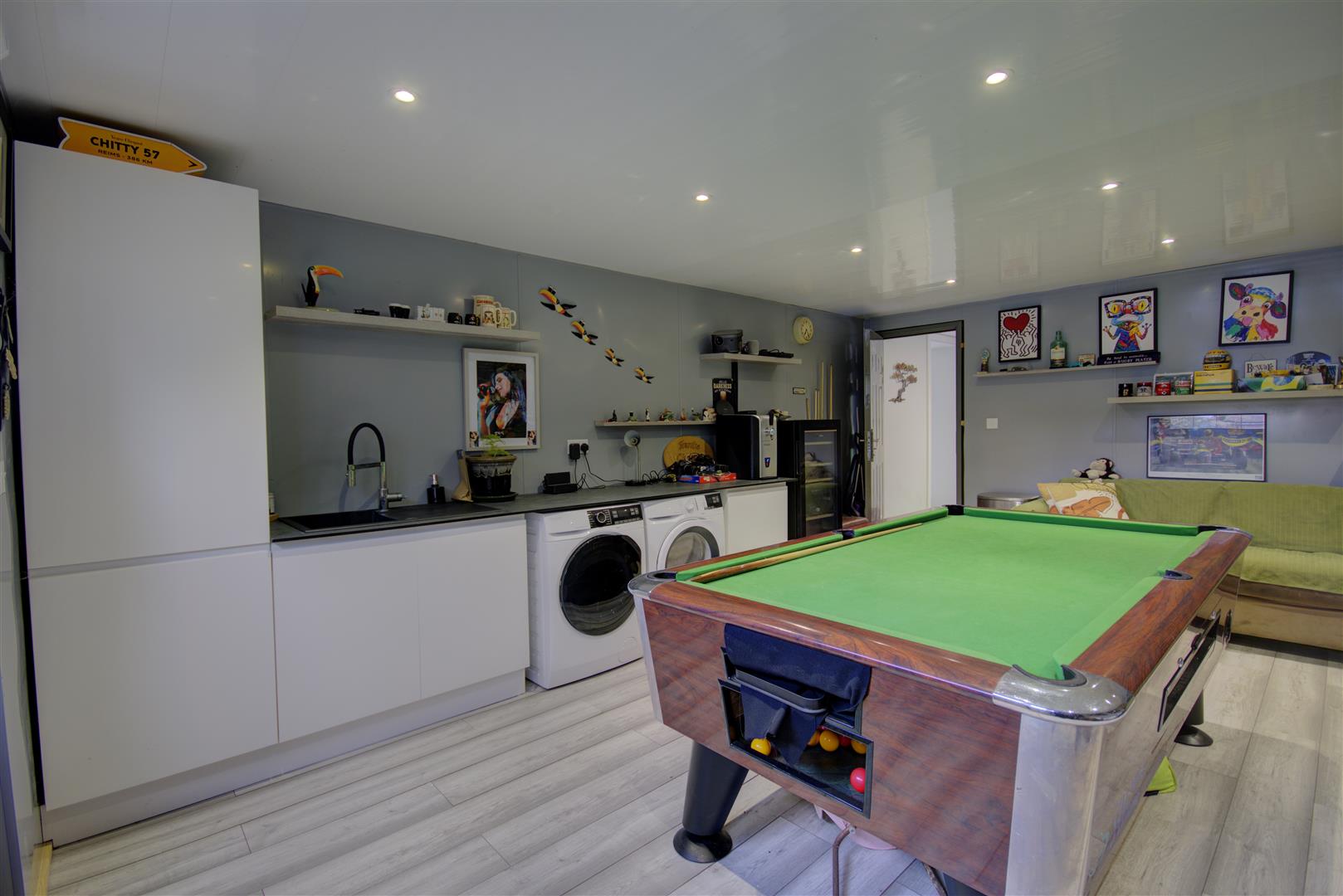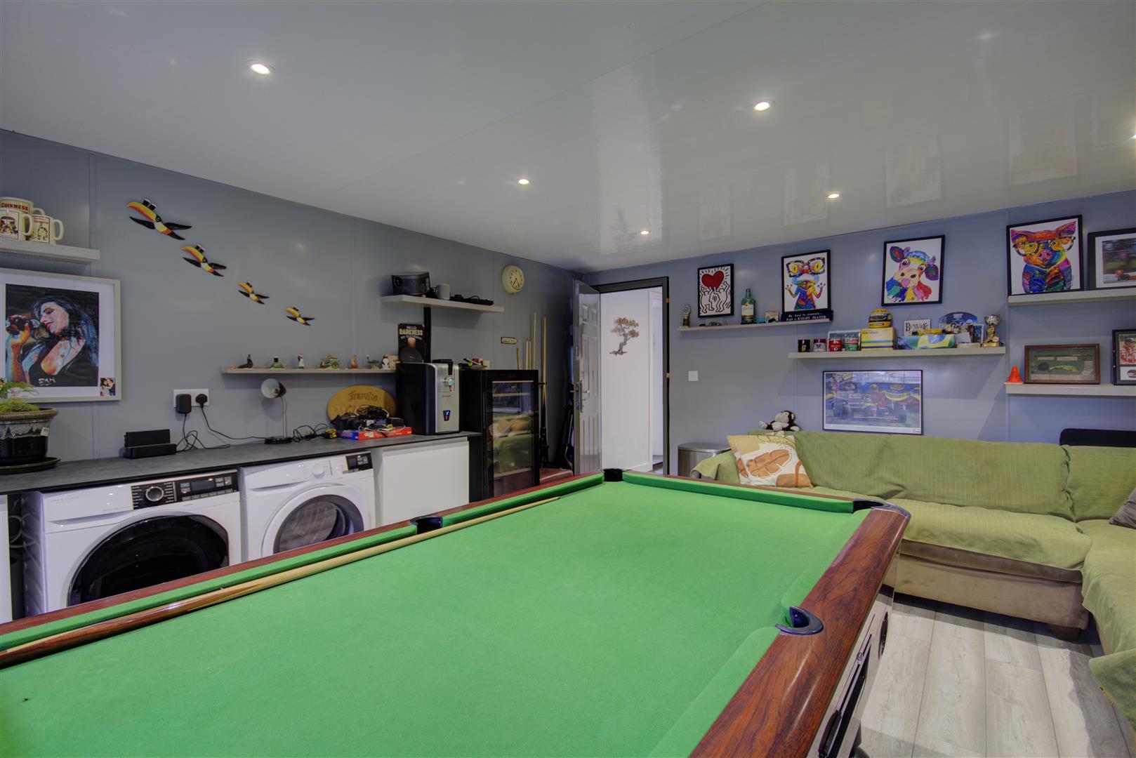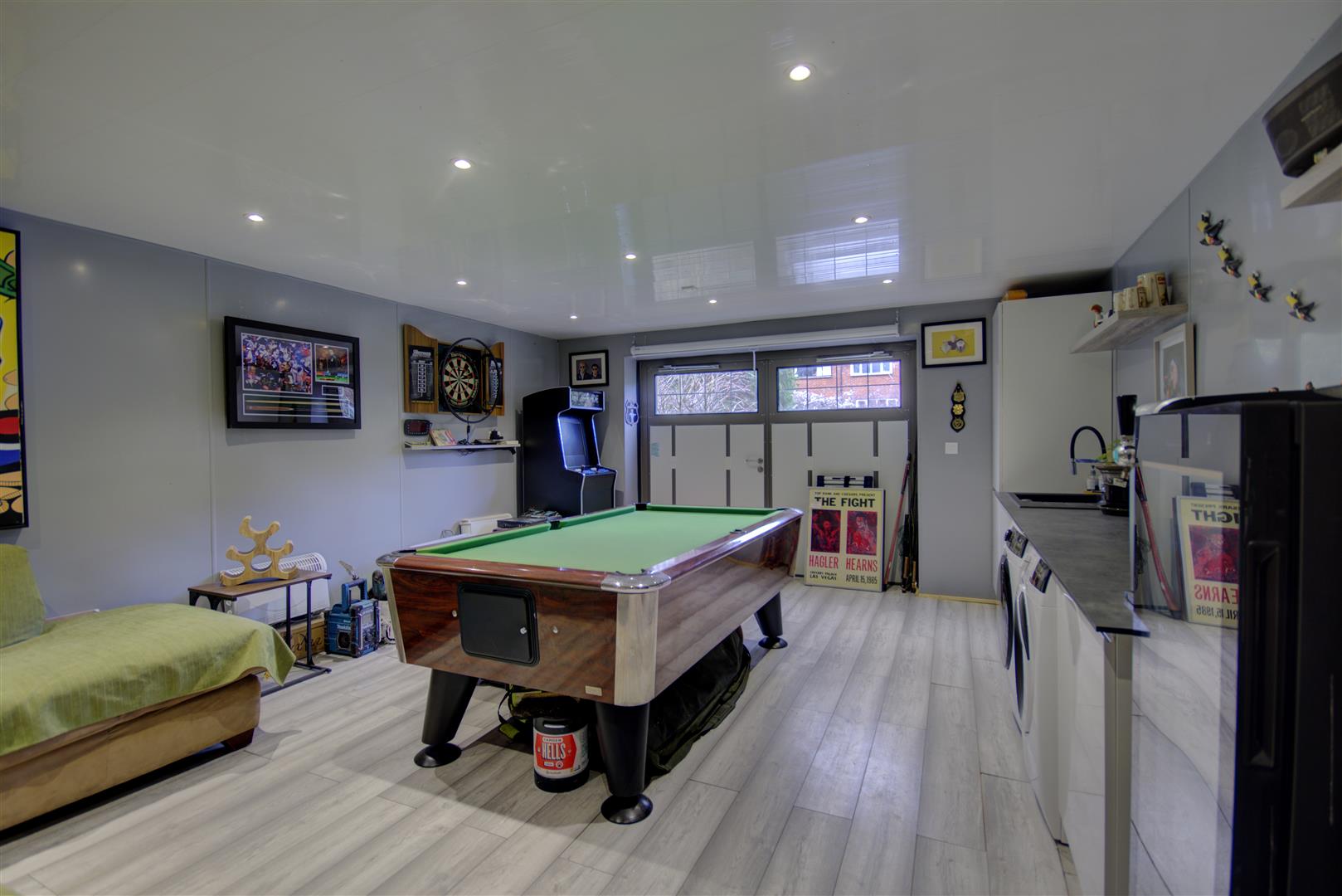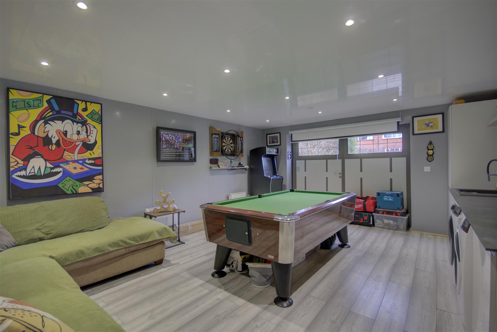 To the front, the property benefits from ample off-road parking, while a substantial garage — currently arranged as a games room — offers further flexibility and potential.