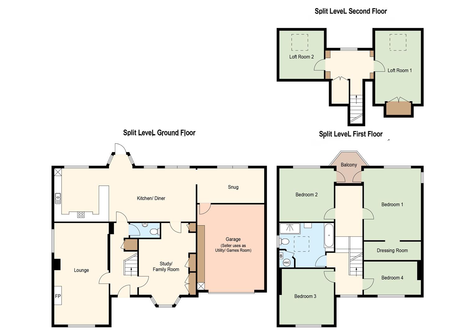 The first floor offers four well-appointed bedrooms, providing comfortable and private accommodation for the whole family with main bedroom has steps up leading to dressing room area. In addition, two loft rooms add further versatility and can be utilised as home offices, hobby rooms, guest space or additional storage, making this a home that can easily evolve with its owners.