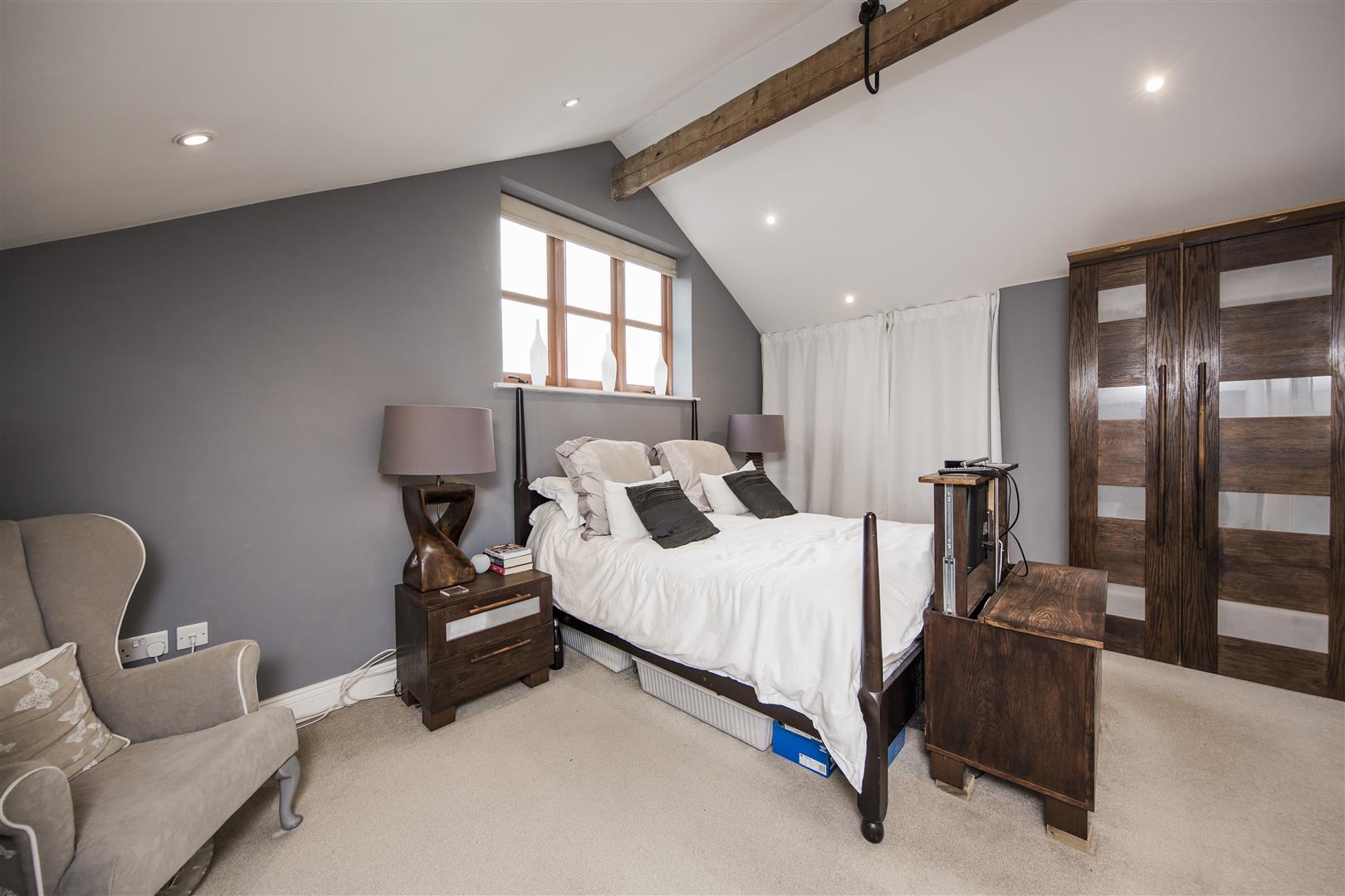 Large double bedroom with wardrobes in eaves, two radiators, vaulted ceiling with original exposed beams, inset ceiling spotlights, window to side, and velux window to rear.
