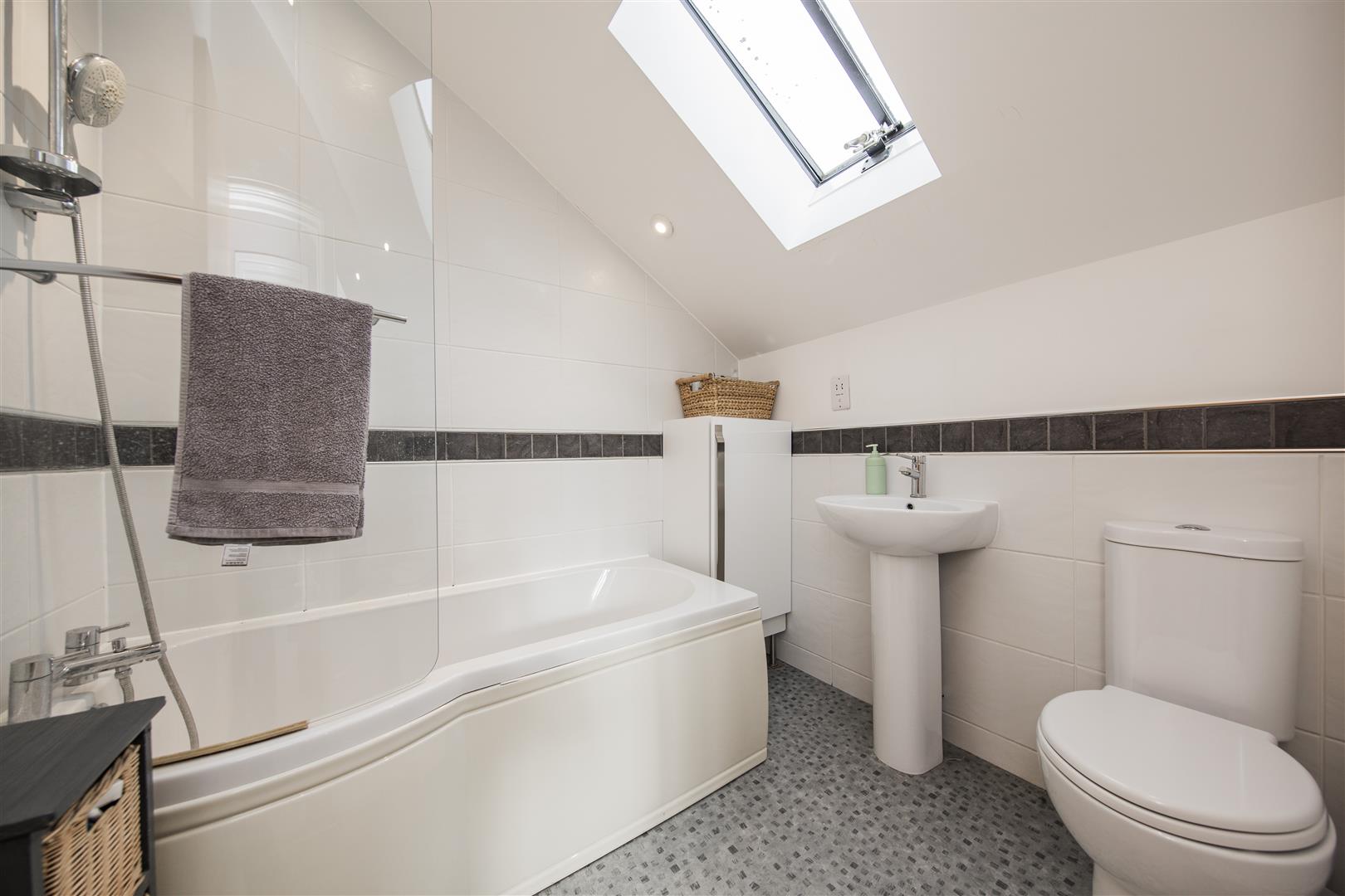 P-shaped bath with glass shower screen, mixer tap and wall hung shower attachment, pedestal wash hand basin, WC, radiator, part tiled walls velux window.