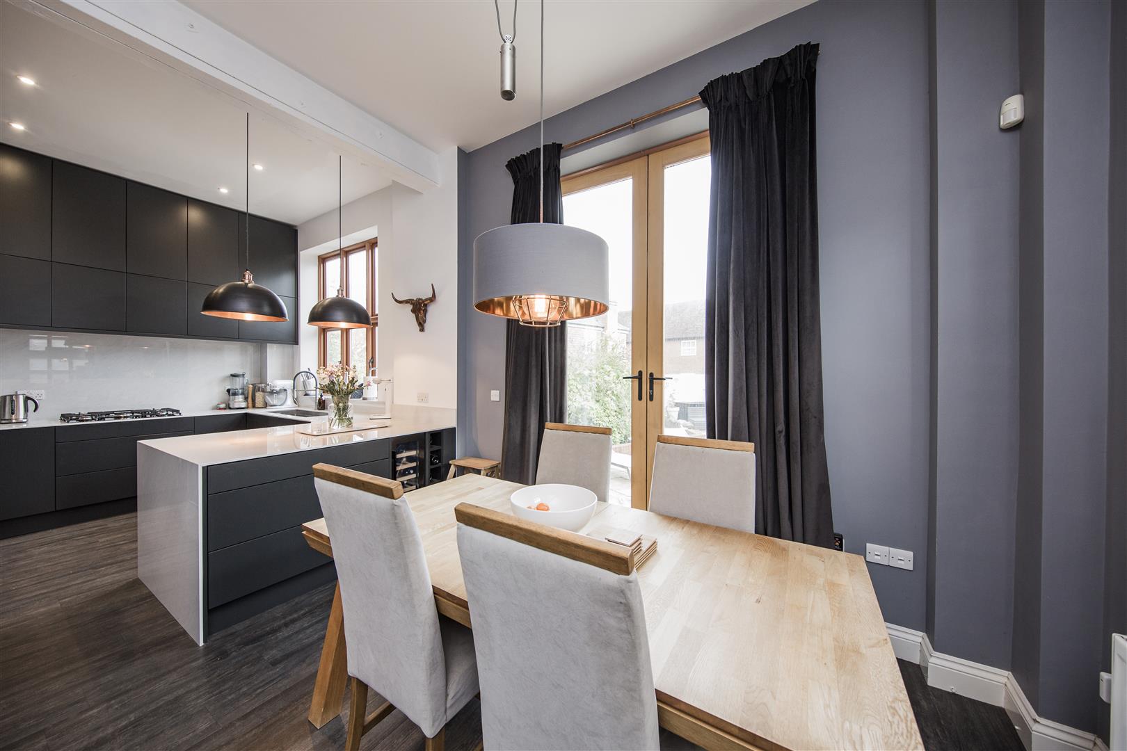 A fabulous refitted kitchen with full height cupboards and large island style breakfast bar looking out over the open plan living dining area. Contrasting stone work surfaces, upstands and splashbacks. A stunning modern refitted social kitchen.