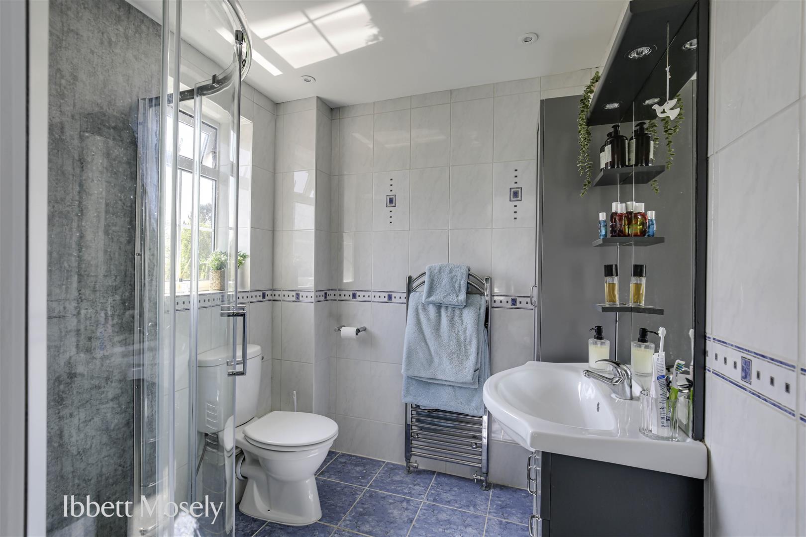 With enclosed bath with separate shower over, w.c. and hand basin. Chrome ladder style towel rail, double glazed window, tiled walls, tiled flooring and shelved cupboard with sliding mirror door. Stunning views to the south