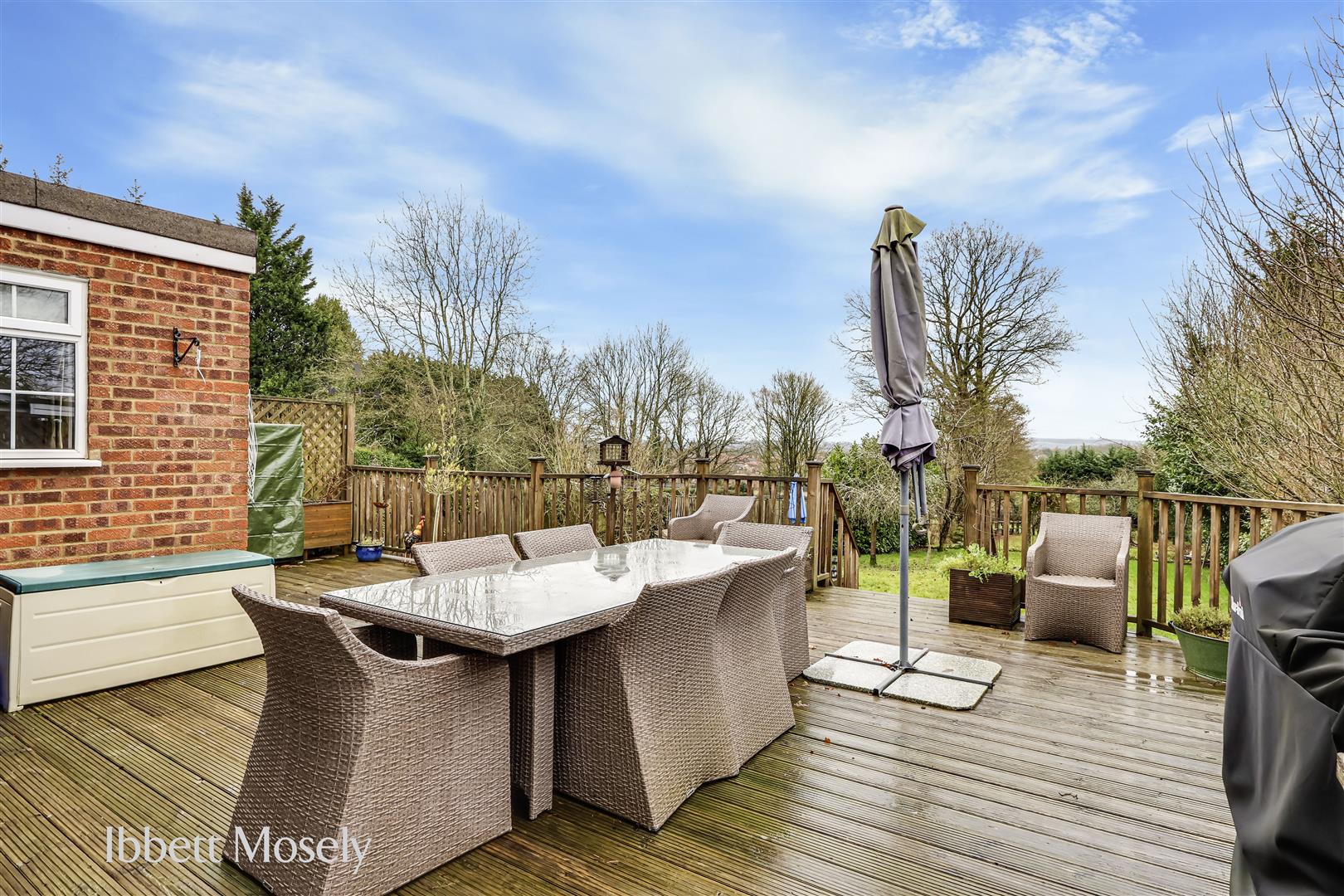 The back garden is on the south of the house and enjoys views from the large raised deck with balustrade and steps down to the lawns, there is outside lighting and a power supply to the decked area.