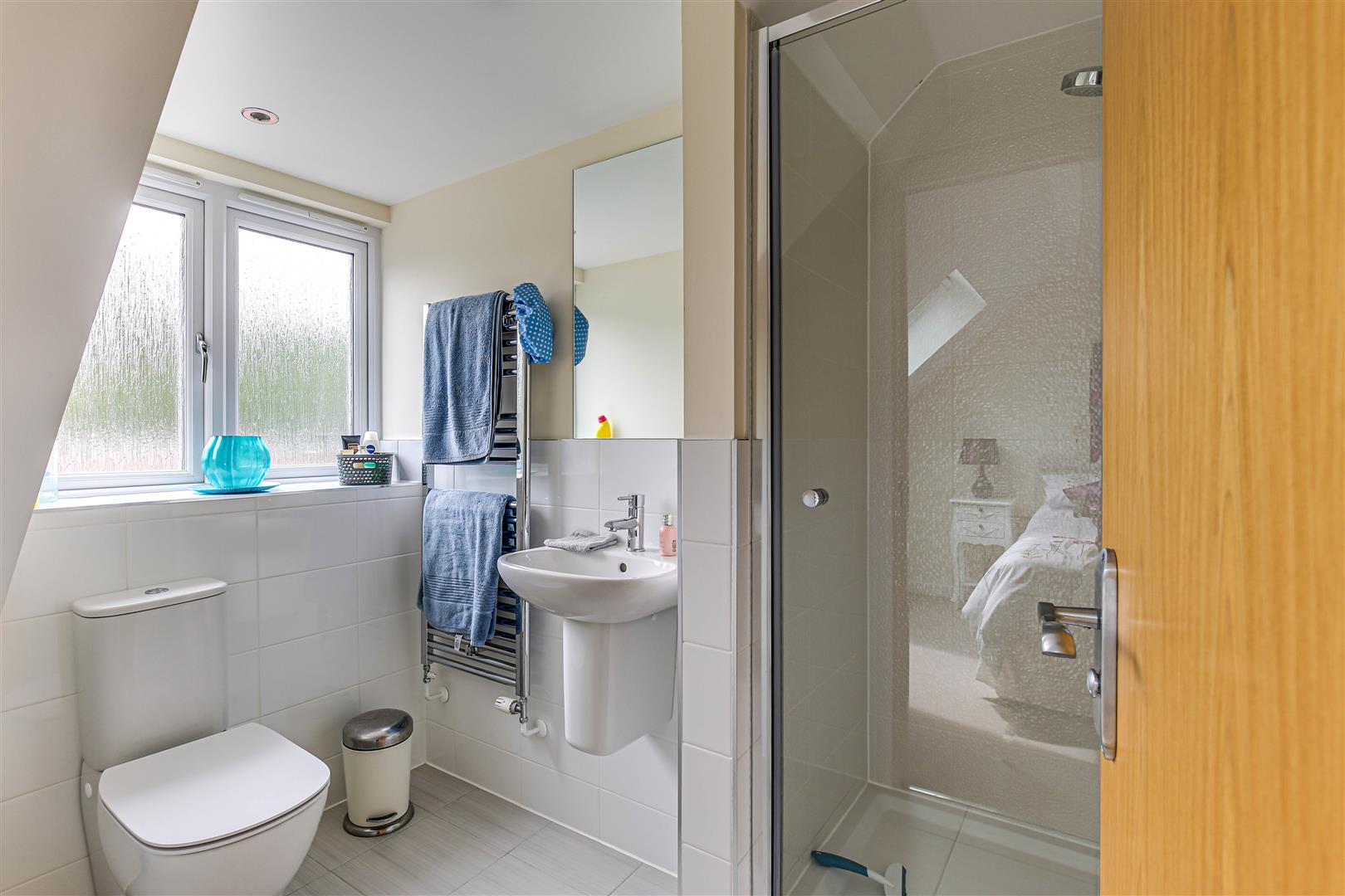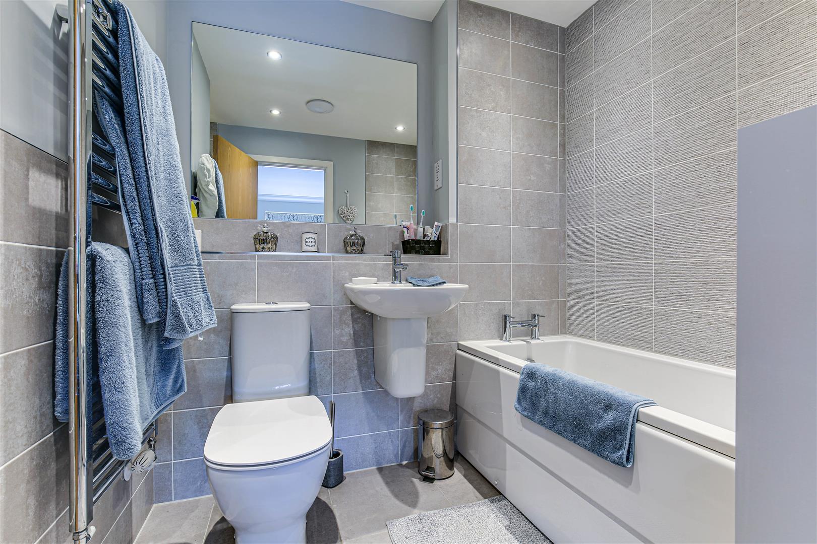 With enclosed bath, separate shower cubicle, W.C. and hand basin. Part tiled walls and tiled flooring.