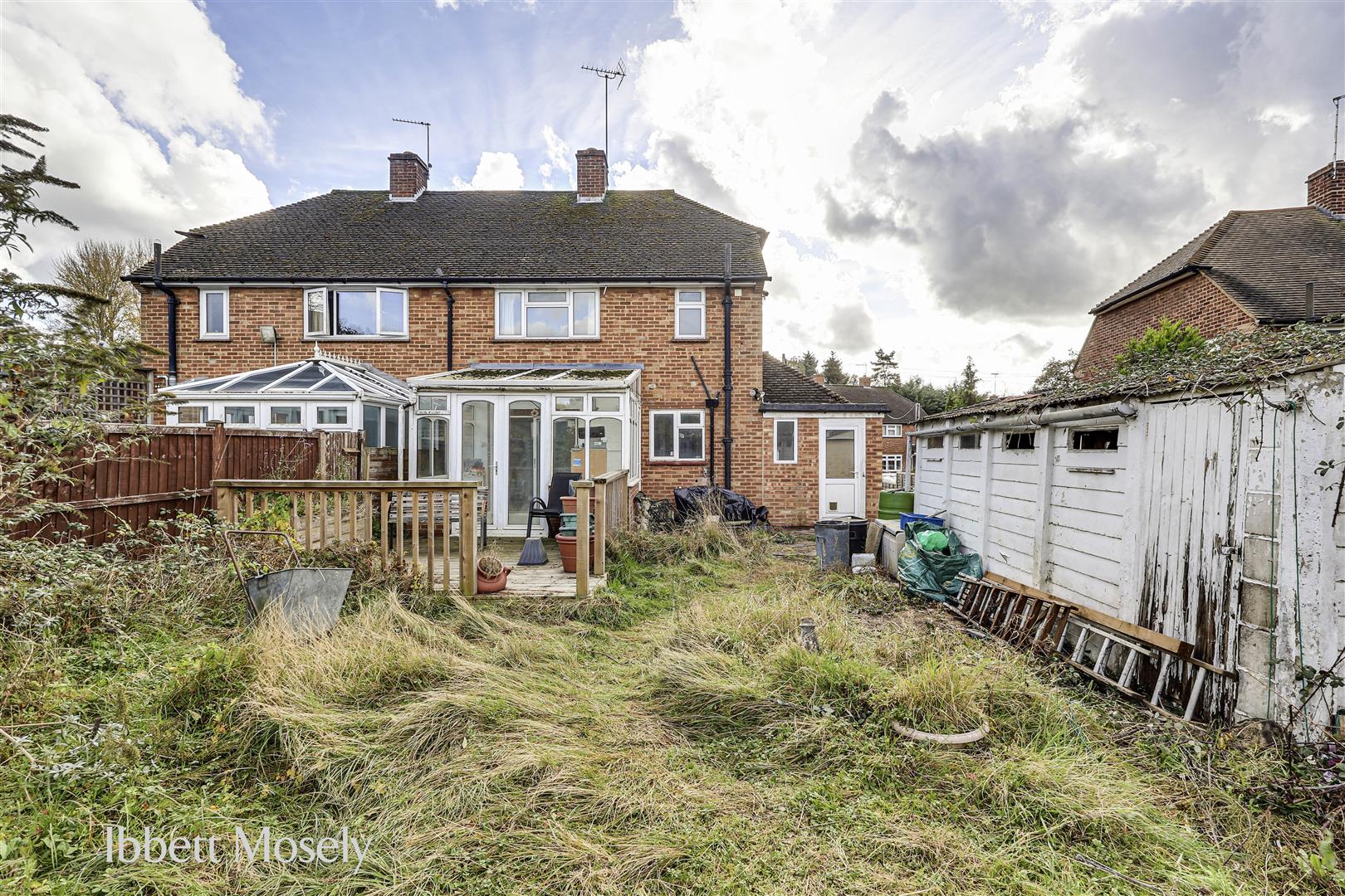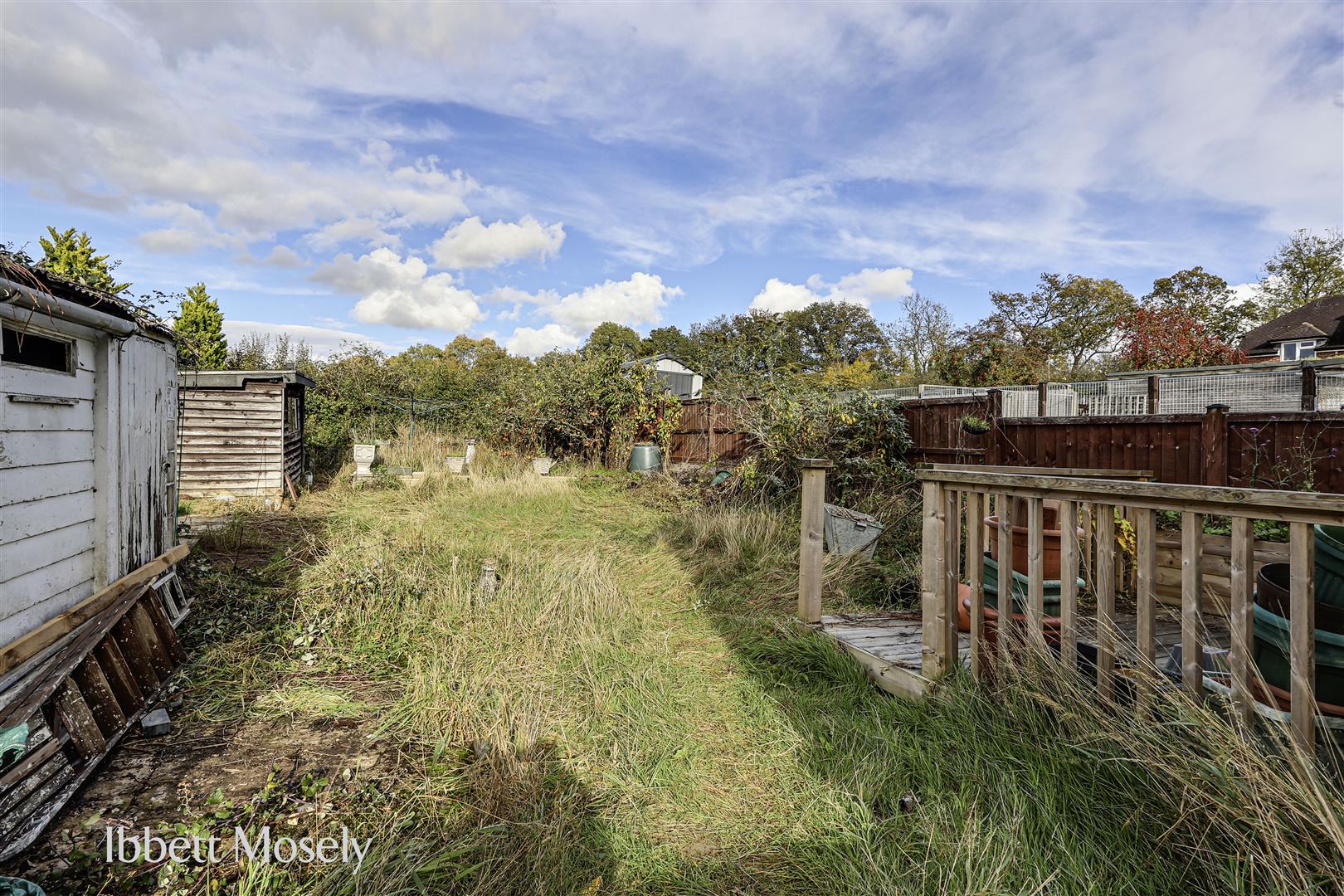 Requires attention but includes a large garden shed, a small greenhouse, lawns, patio and a variety of trees and shrubs