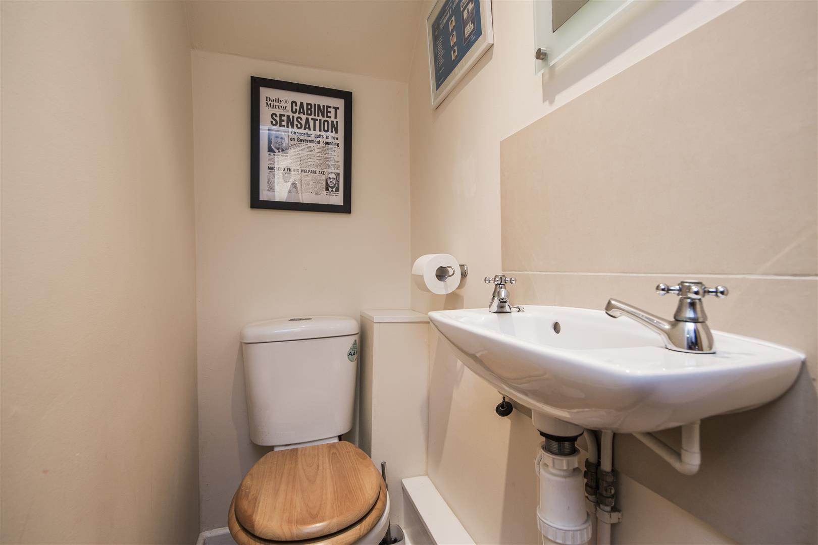 The downstairs WC is small but practical, featuring a white ceramic basin and toilet with a wooden seat. The neutral decor includes pale walls and simple tiling, with a frosted window providing light and privacy.