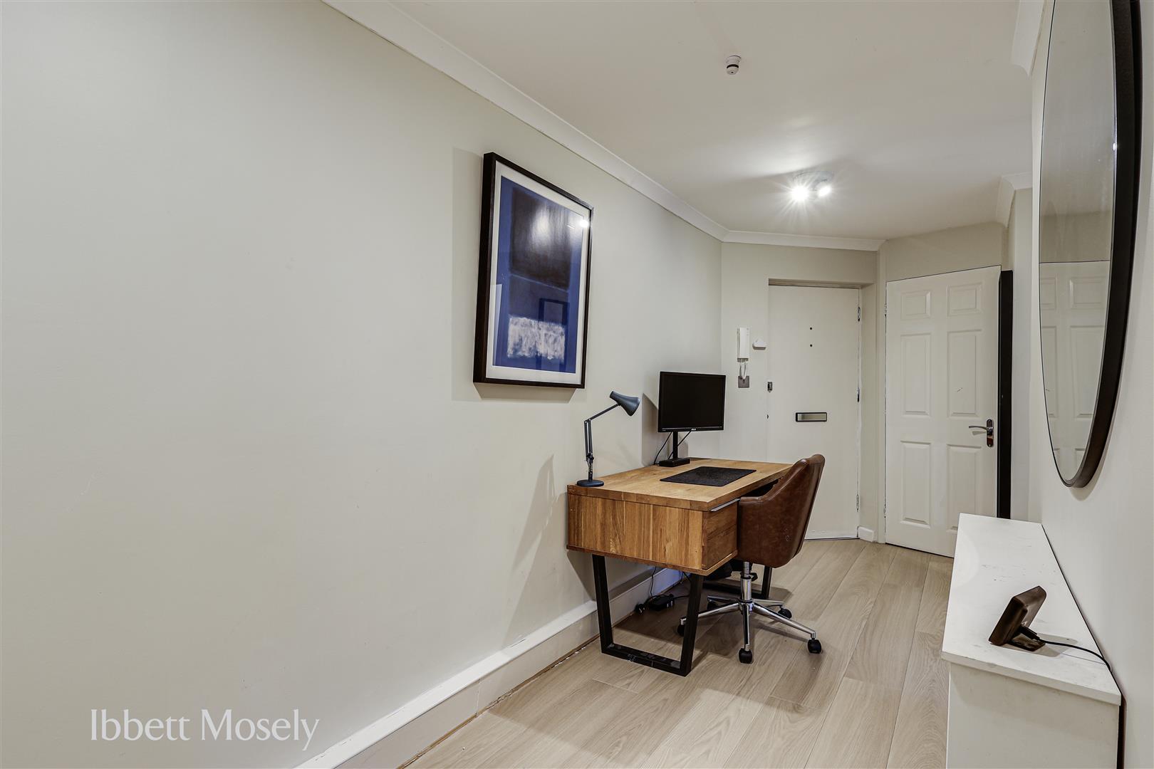 The property is entered via an exceptionally spacious entrance hall, which comfortably doubles as a useful study area and offers excellent practicality with a large utility cupboard housing a newly installed consumer unit. To the left is a separate WC, positioned alongside the recently modernised bathroom, which features a contemporary suite complemented by a stylish backlit mirror as well as an airing cupboard. The bedroom is a good size currently housing a double bed with space surrounding and storage. Completing the accommodation is an inviting living/dining room, providing a spacious open-plan feel with an attractive archway leading through to the kitchen. The kitchen has a range of built-in appliances, creating a functional and modern living