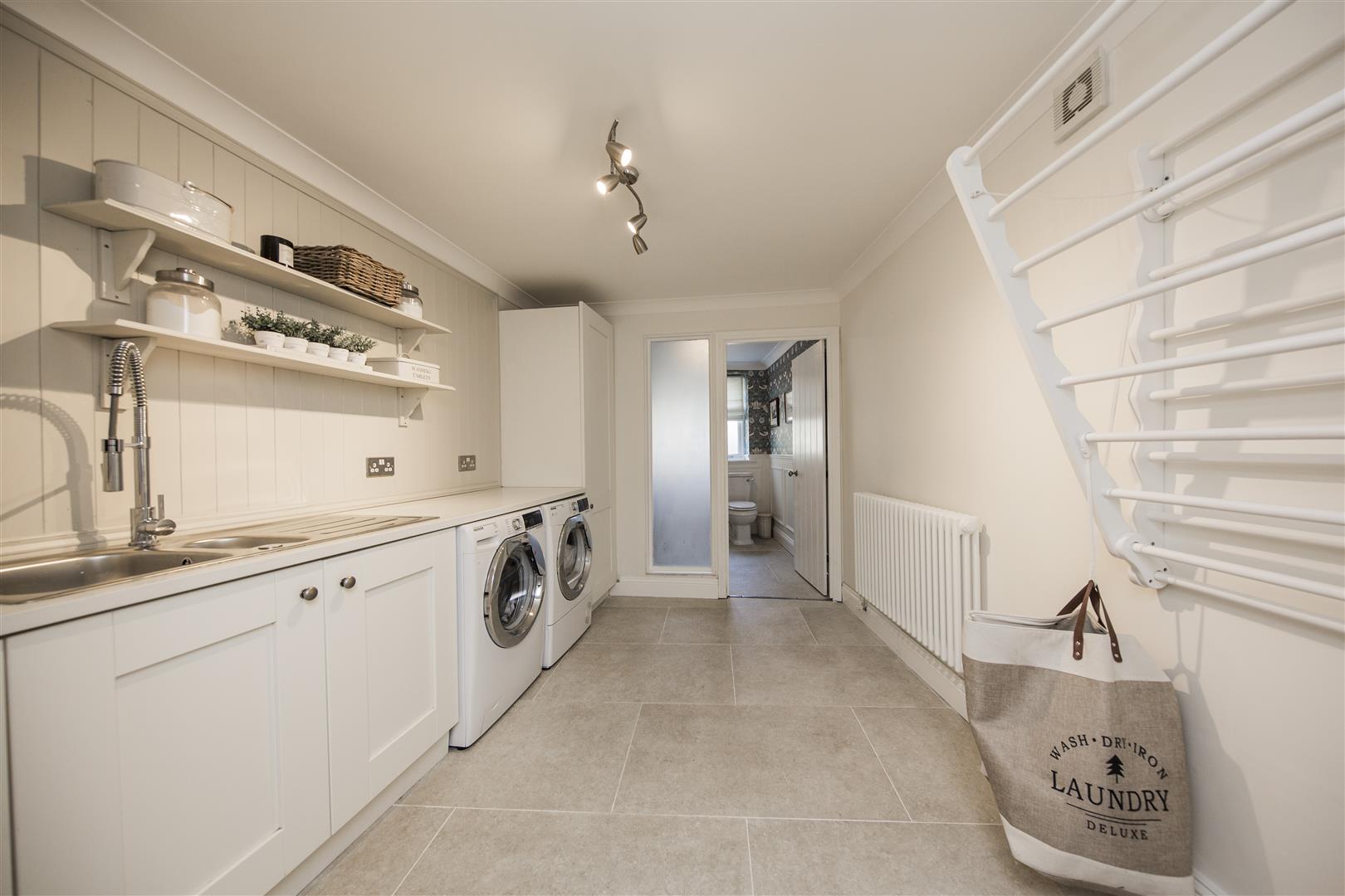 This utility room is a large practical and neat space featuring tiled flooring and fitted with modern units, including a sink and space for a washing machine and dryer. Its neutral palette and ample storage make it an efficient room for laundry and household tasks.