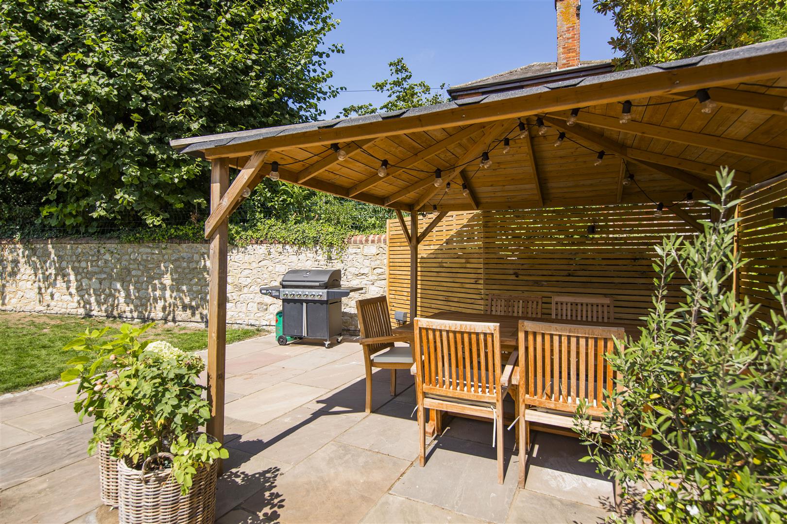 The rear garden is a large, private and well-maintained space featuring a generous lawn bordered by mature trees and shrubs. A paved patio area provides an ideal setting for outdoor dining and relaxing, complete with a covered seating area and barbecue facility, perfect for entertaining in summer months.