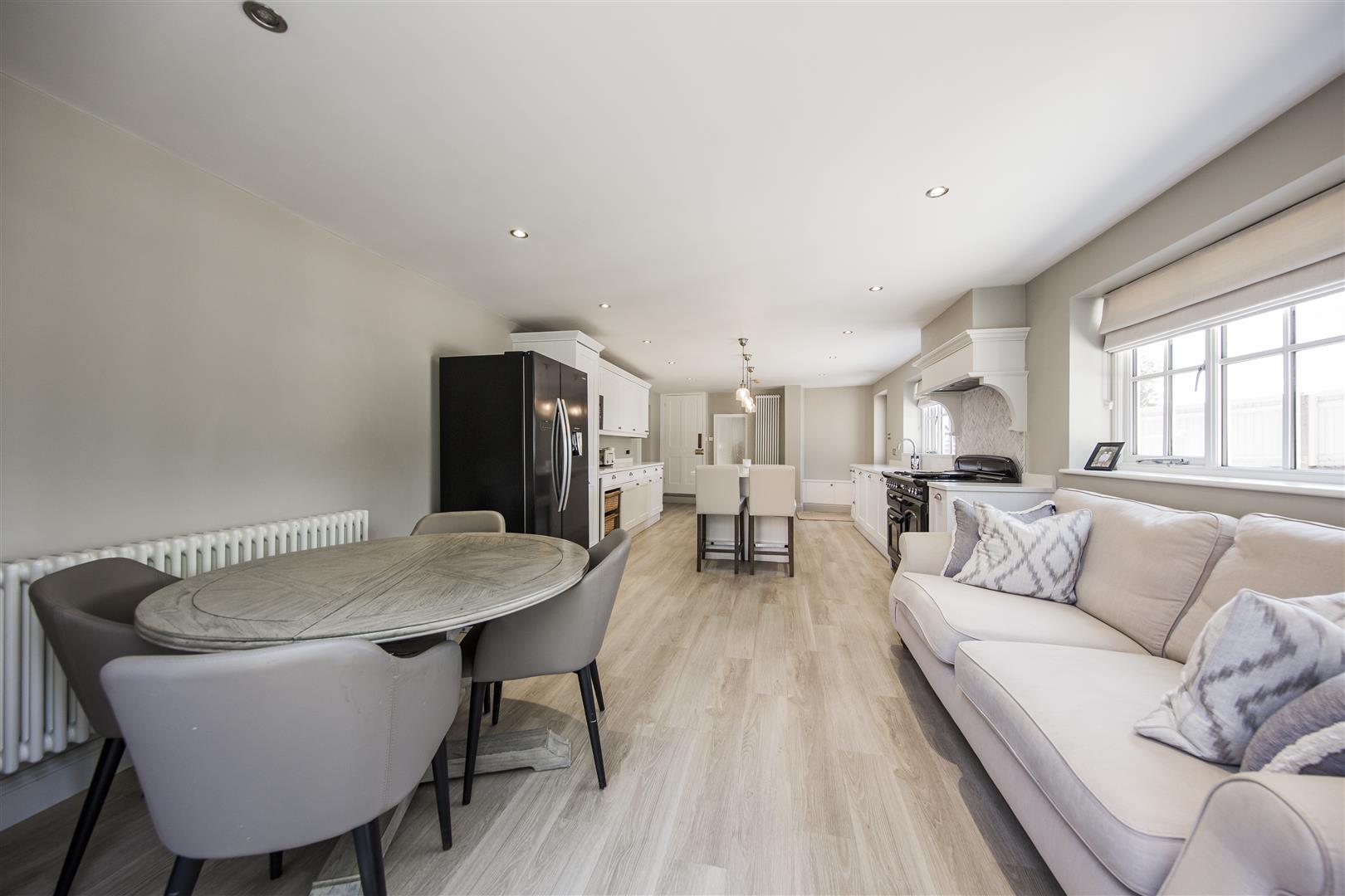 This kitchen diner is a bright and spacious area featuring a long central island with curved edges, ideal for casual dining or meal preparation. The space is elegantly designed with white cabinetry, a large range cooker, and integrated appliances. Natural light floods the room through multiple windows and glass doors that lead to the garden, enhancing the light oak wood-effect flooring that runs throughout. The kitchen opens seamlessly onto a dining area with a round table and chairs, creating a welcoming space for family meals or entertaining guests.