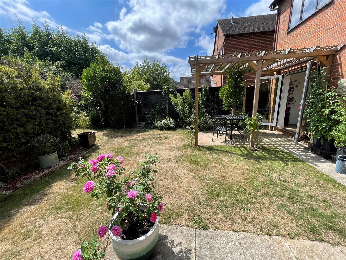 The southerly-facing garden is a true asset of the home, thoughtfully designed with compartmentalised areas that provide both privacy and sheltered spaces for socialising and relaxation. Part walled and featuring raised borders, a lawn, and mature planted beds, the garden is ideal for entertaining, children’s play, or quiet enjoyment. The garden also offers access to the garage and through to the front of the property.