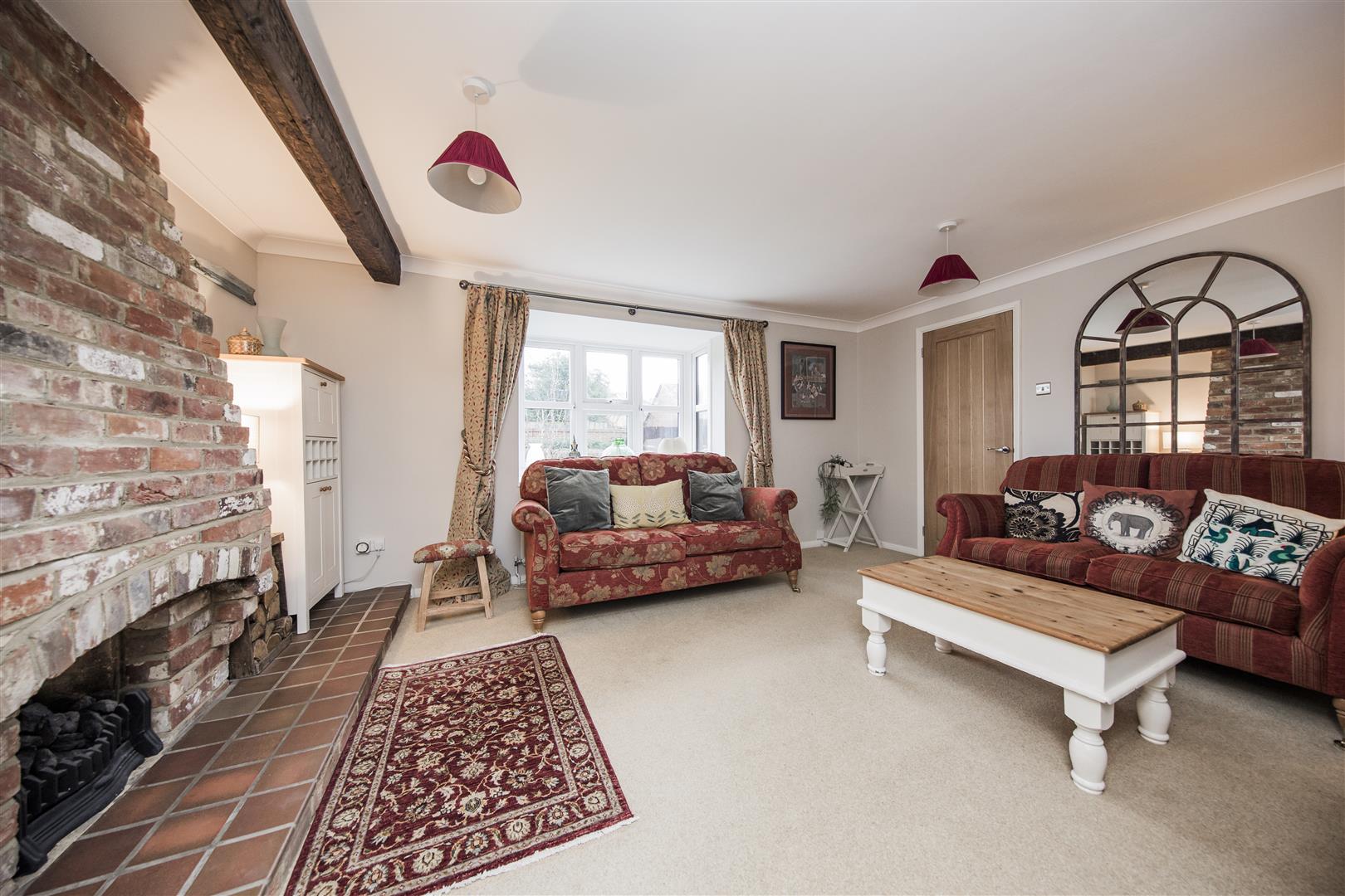 A covered open porch leads into an inviting entrance hallway, which benefits from a built-in coat and shoe wardrobe, useful under-stairs storage, and a recently installed downstairs WC. To the front of the house, the well-proportioned sitting room features a charming square bay window and an attractive brick fireplace, creating a warm and cosy atmosphere for relaxed days and evenings.