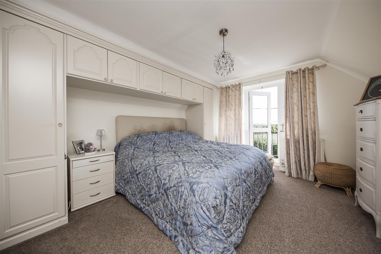 This spacious bedroom features a large bed nestled within built-in wardrobes and overhead storage, creating a neat and practical sleeping area. Soft carpeting underfoot adds warmth, while a glass door opens to a balcony, allowing plenty of natural light to flood the room and offering lovely views over the surrounding countryside. Neutral curtains frame the door, contributing to the calm and restful atmosphere.