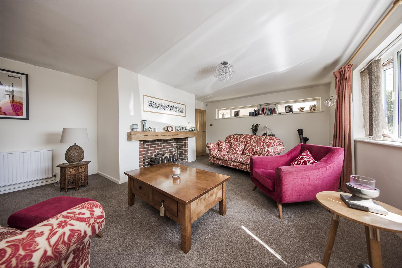 A spacious sitting room filled with natural light from large windows. The room features a chimney breast with an exposed brick fireplace and a wooden mantle, offering a cosy focal point. Comfortable seating in patterned and plain fabrics surrounds a wooden coffee table, making this a welcoming space for relaxation and socialising.