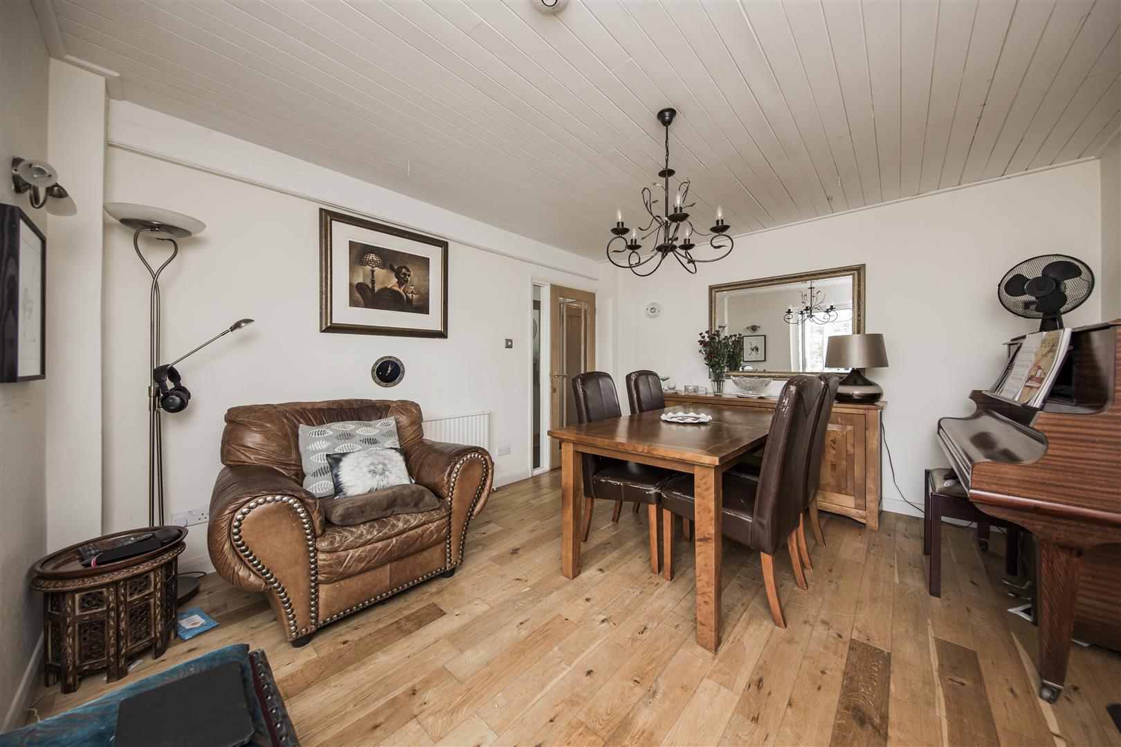 This dining room features a wooden floor and a dining table with high-back leather chairs, creating an inviting area for meals and entertaining. A chandelier hangs from the ceiling adding a touch of elegance, while sliding doors open into the adjoining conservatory, offering a bright and airy extension to the space.