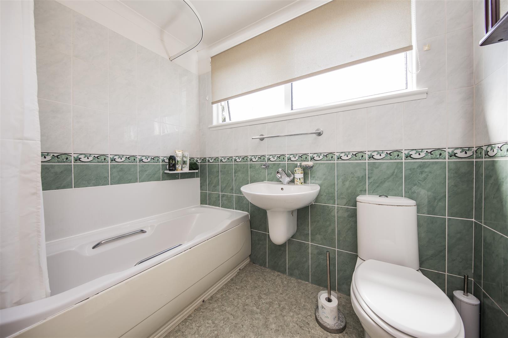 The bathroom boasts a clean and fresh design with a white suite comprising a bathtub with a shower over, a pedestal basin, and a toilet. Green tiling lines the lower half of the walls with a decorative border, and a wide frosted window above lets in natural light while maintaining privacy.