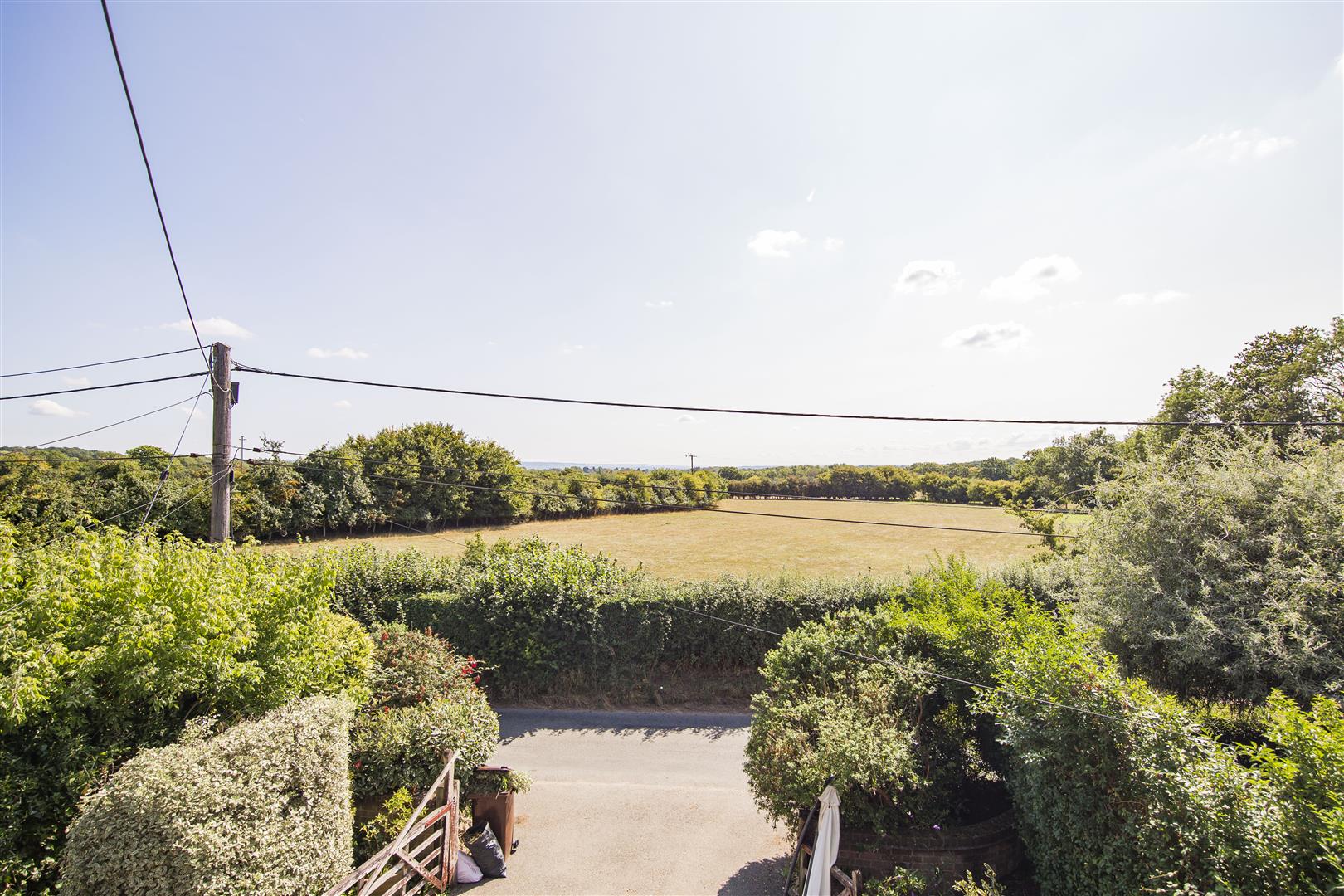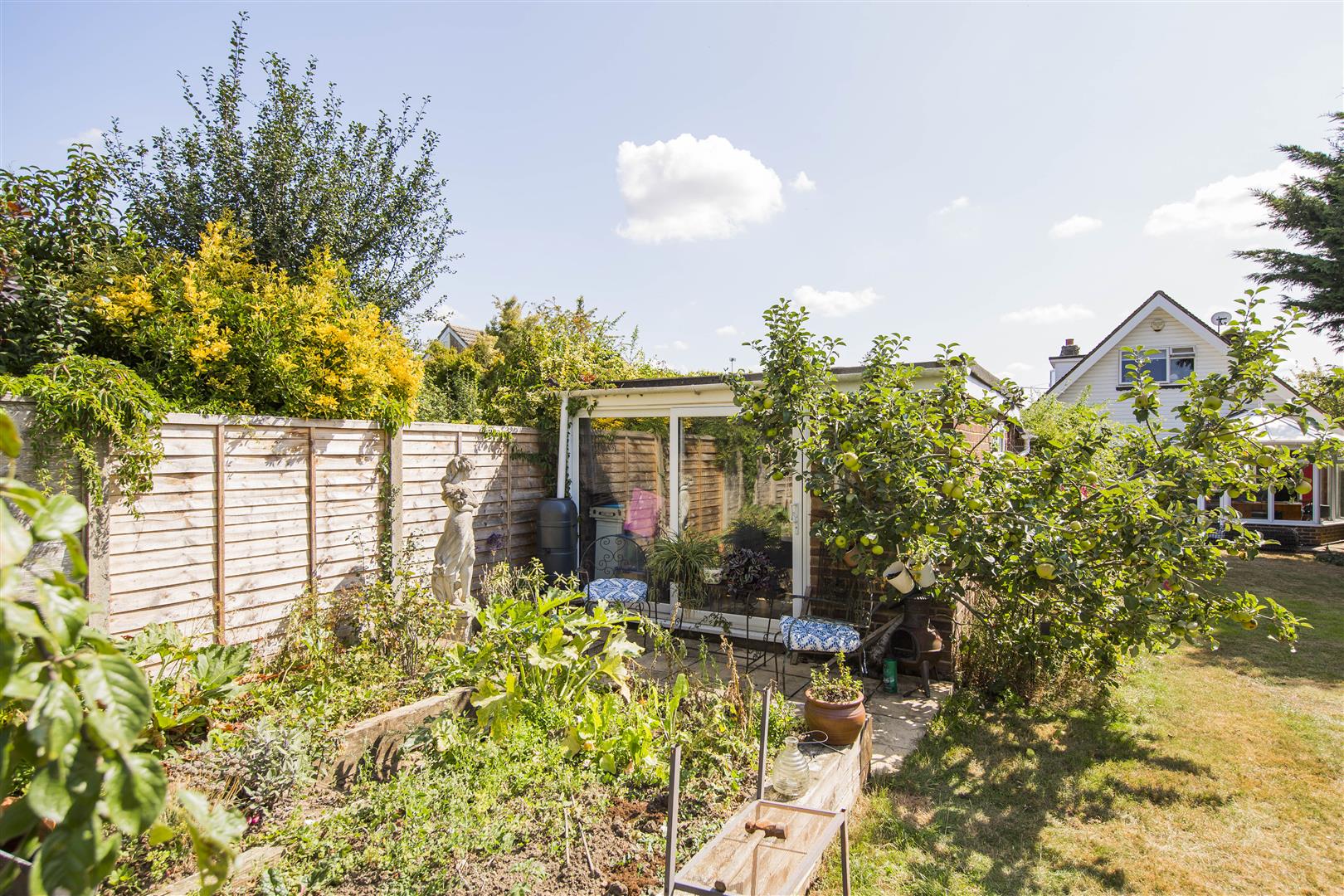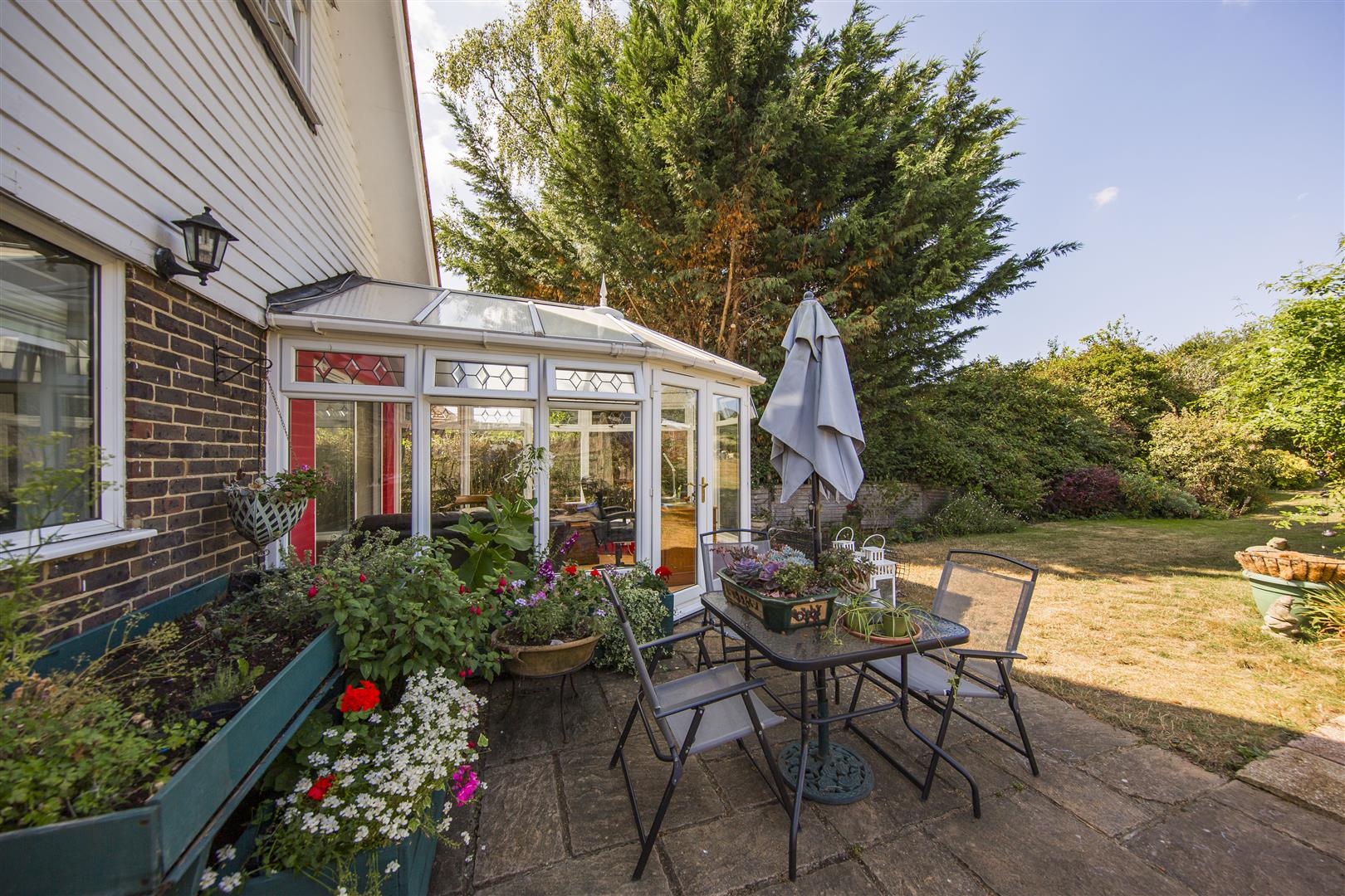 The rear garden is a standout feature of this property, offering a generous length of lawn bordered by mature trees, shrubs and flower beds. A paved patio area provides a comfortable seating space with outdoor furniture and parasol. The garden enjoys open views over the surrounding countryside, creating a tranquil and private outdoor retreat. There is also a vegetable patch with a greenhouse and a shed, perfect for gardening enthusiasts.