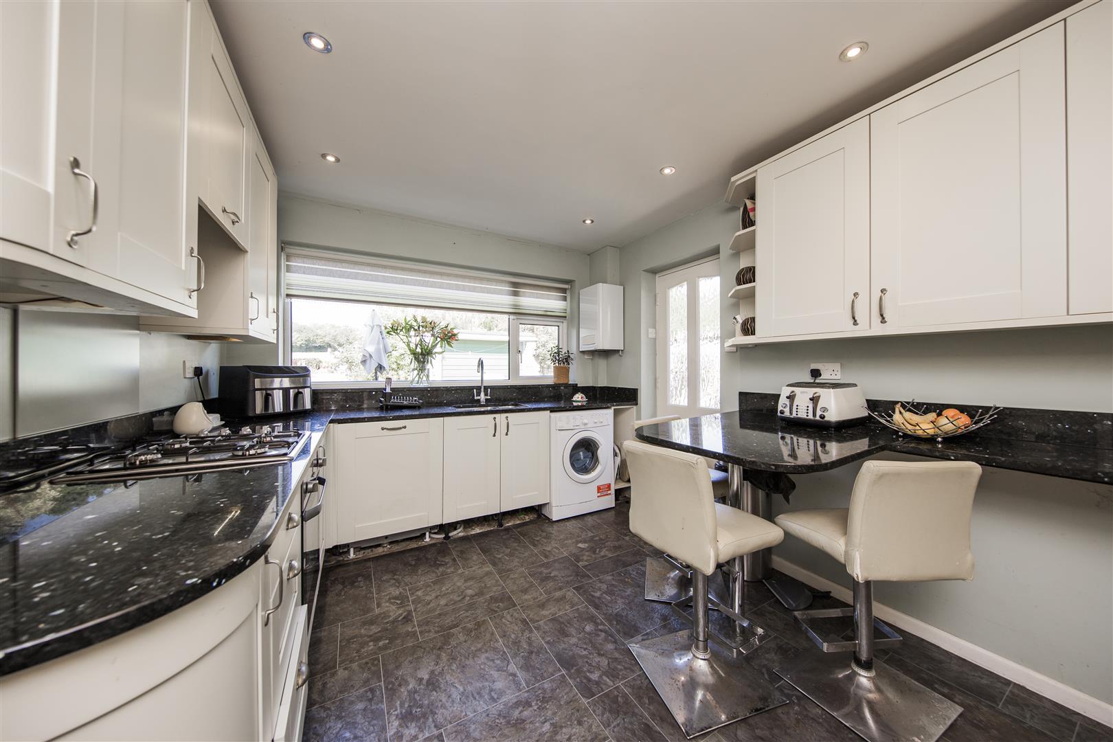 The kitchen is well appointed with dark tiled flooring and black granite work surfaces that contrast smartly with white cabinetry. Appliances include a gas hob, oven, and integrated washing machine and dishwasher. A breakfast bar with seating provides a casual dining spot, and a window above the sink offers views out to the garden. A door leads directly to the outside, adding convenience.