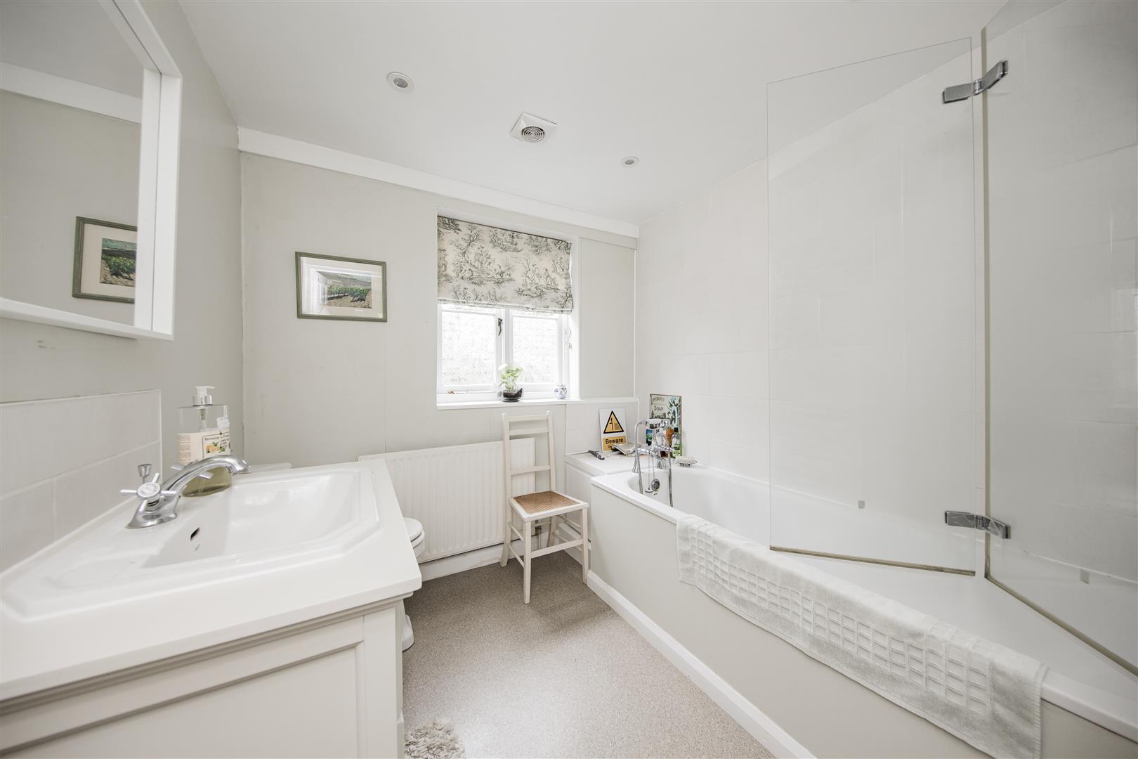 A well-appointed bathroom featuring a bath with a power shower with glass screen, a wash basin set in a traditional style vanity unit and w.c. A window to the side allows light and ventilation. The room is decorated in light, neutral tones creating a fresh and clean atmosphere.