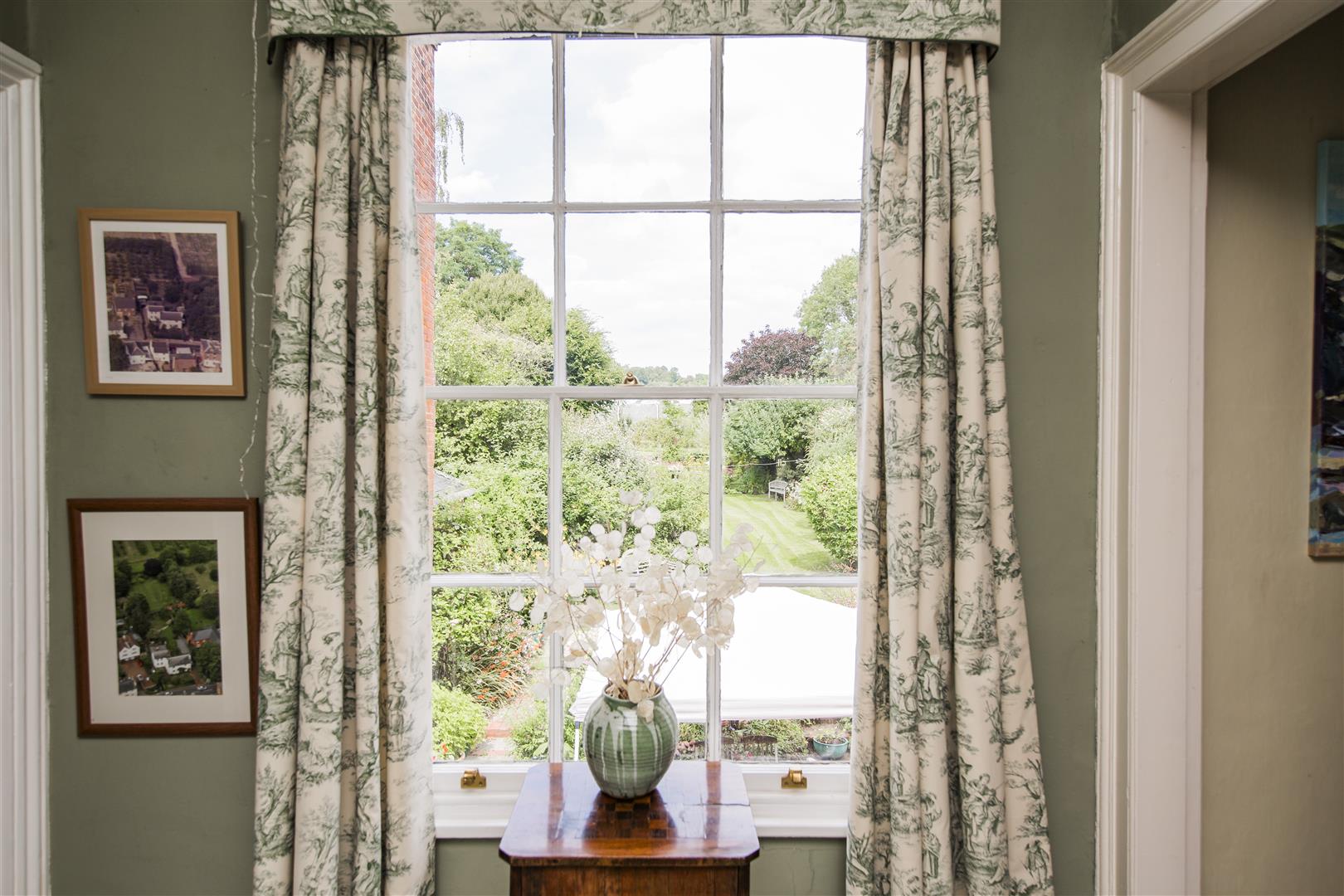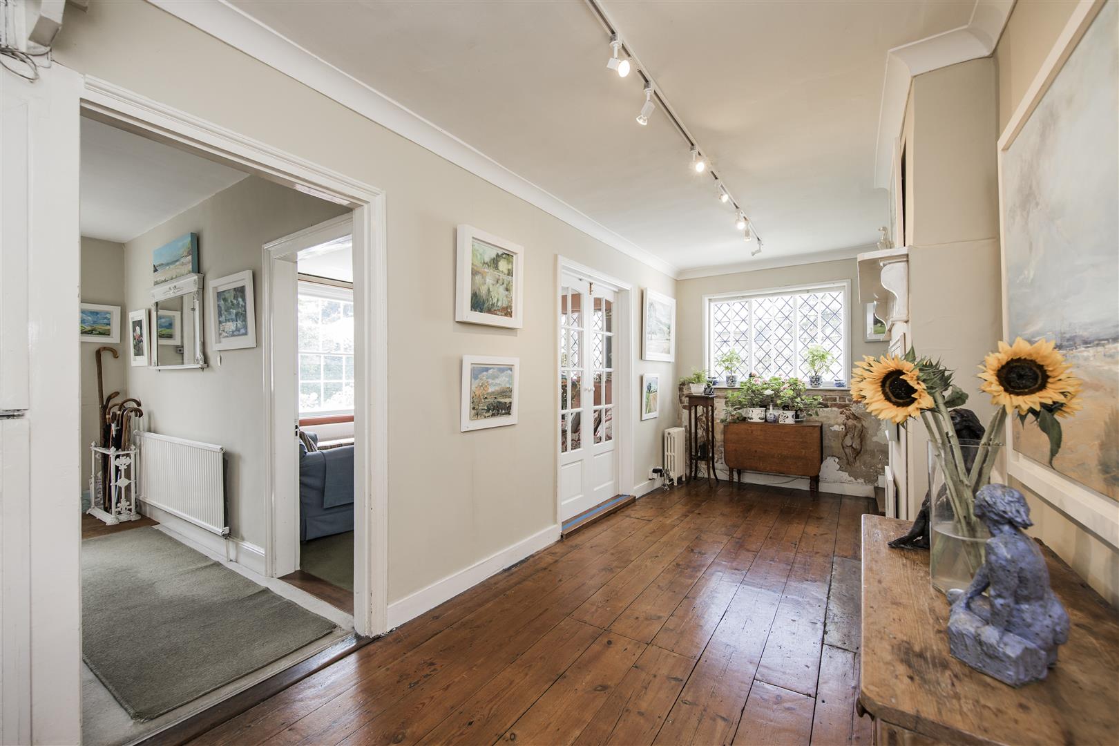 This comfortable reception room enjoys plenty of natural light from two sash windows. The walls are of neutral shade providing a peaceful backdrop to the traditional furnishings and artwork. A fireplace serves as a focal point with a wood burning stove, enhancing the room’s inviting atmosphere. There are also partially glazed doors to the rear courtyard enhancing the light in this room..