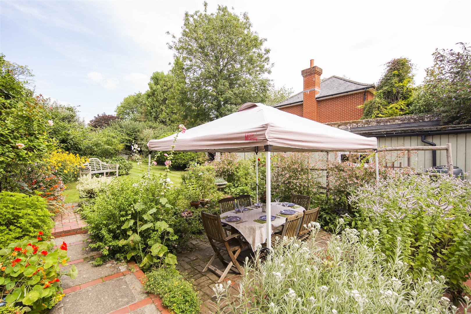 A charming and well-maintained garden with a variety of seating areas including a paved patio with garden furniture beneath a canopy. The garden features a well-kept lawn bordered by mature shrubs and trees, a vegetable growing area, an orchard with a variety of fruit trees. This expansive and private garden is ideal for outdoor entertaining and enjoying nature.
