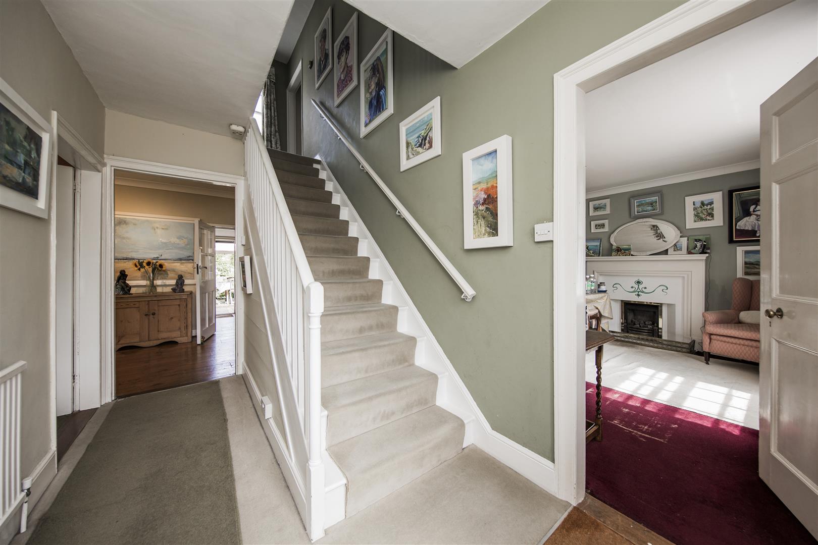 A welcoming entrance hall with carpeted flooring and neutral walls, leading to both the drawing room and other parts of the house with the staircase leading to the upper floors.