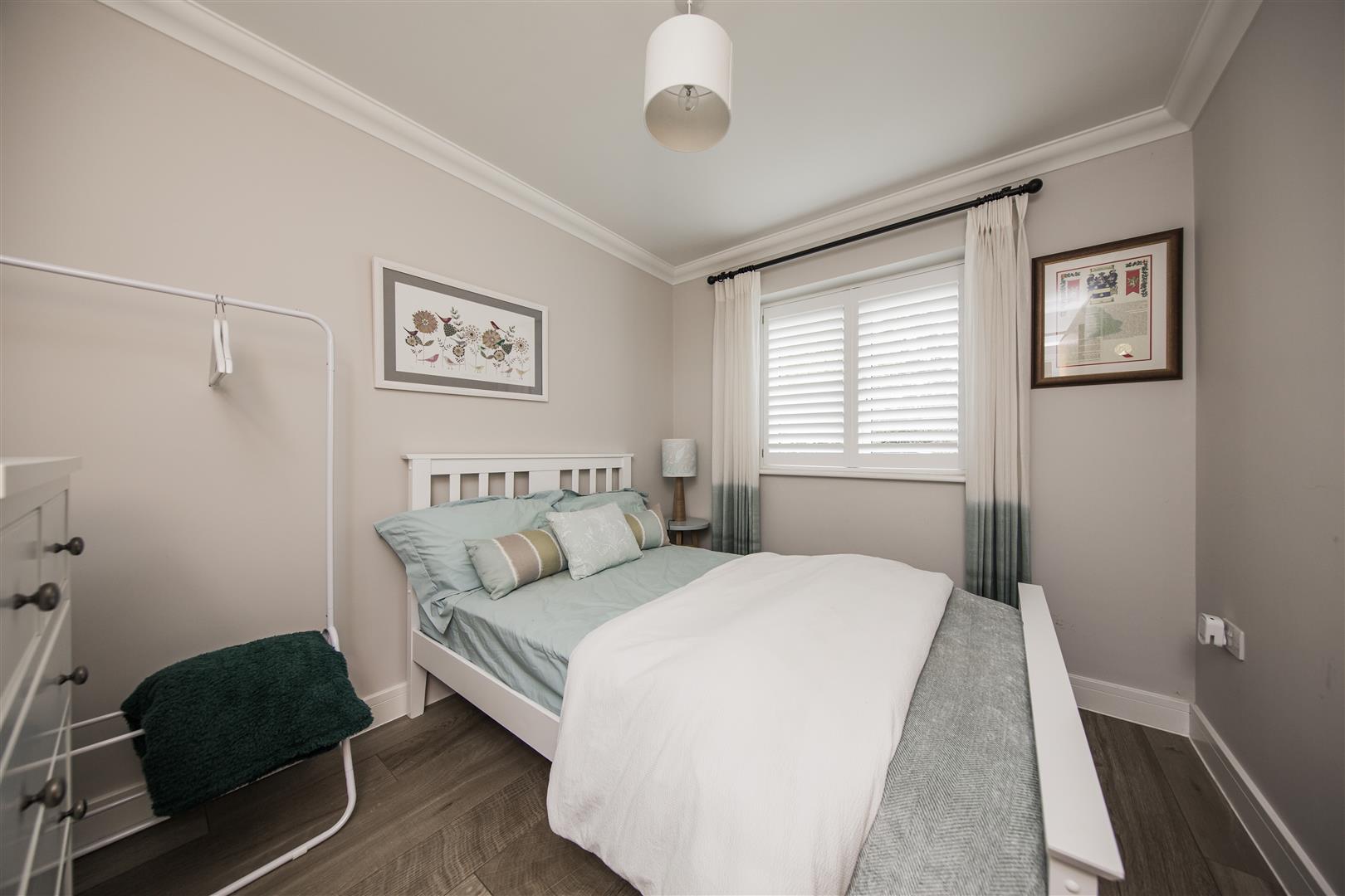 This second bedroom is cosily sized and features a bed with crisp bedding, a window with shutters, and wood-effect flooring. The room's soft colour palette and simple furnishings create a calm and inviting atmosphere, perfect for a child, guest, or home office space.