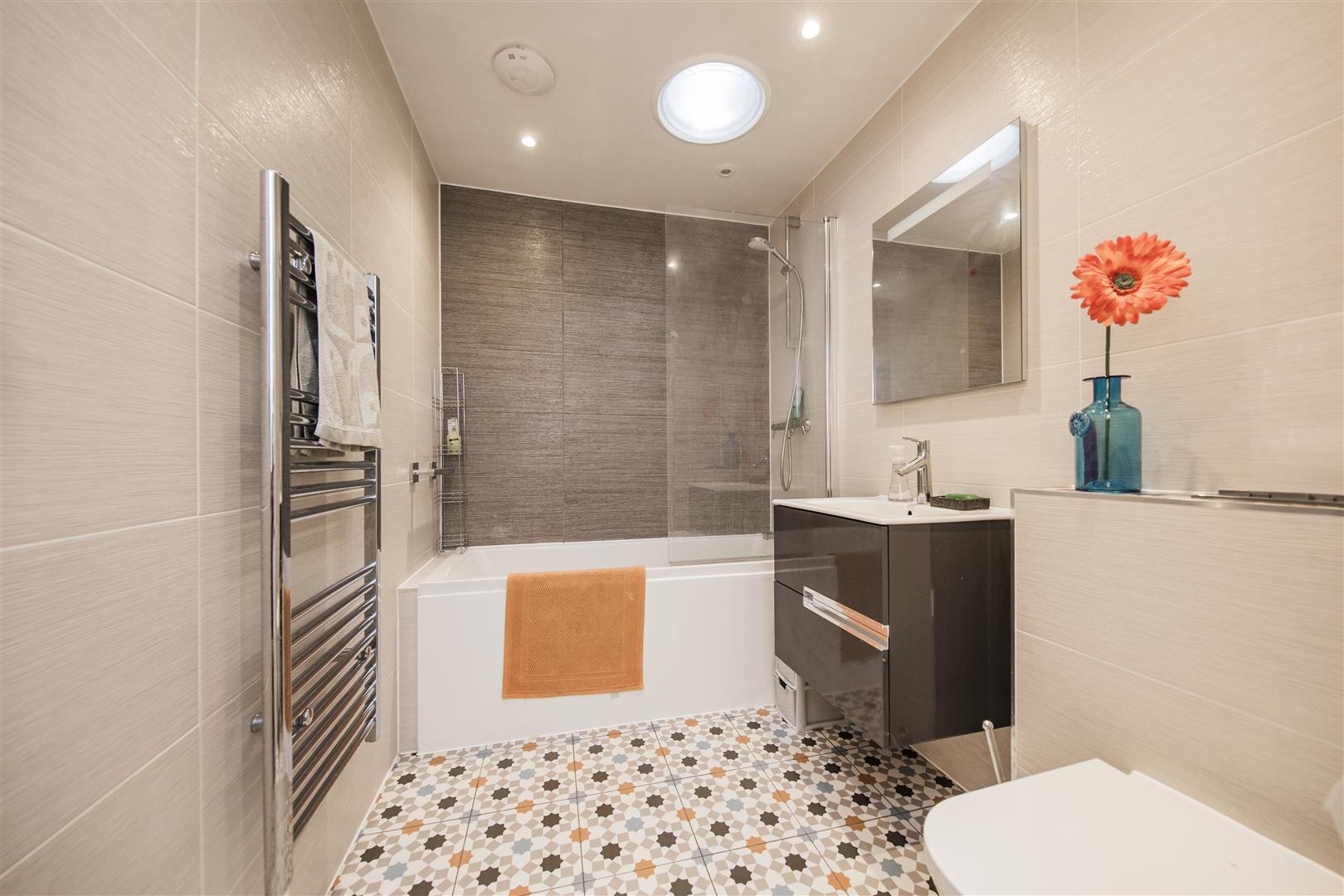 The main bathroom offers a bright and fresh space with a bathtub and shower overhead. It features patterned floor tiles that add character, a wall-mounted mirror, and a heated towel rail. The light tones of the walls complement the natural light coming through a skylight, creating a welcoming atmosphere.