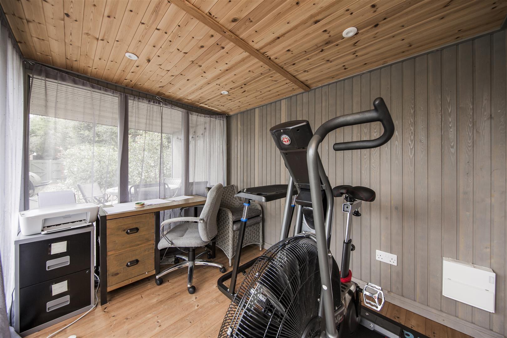 This well-equipped office space offers a dual purpose as a study and gym. It is lined with wooden cladding and features a large window providing plenty of natural light. Furnished with a desk, office chair, and exercise bike, this room is ideal for working from home or keeping active without leaving the property.