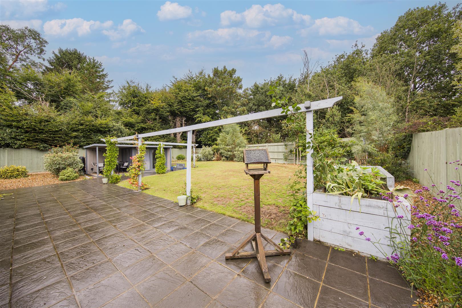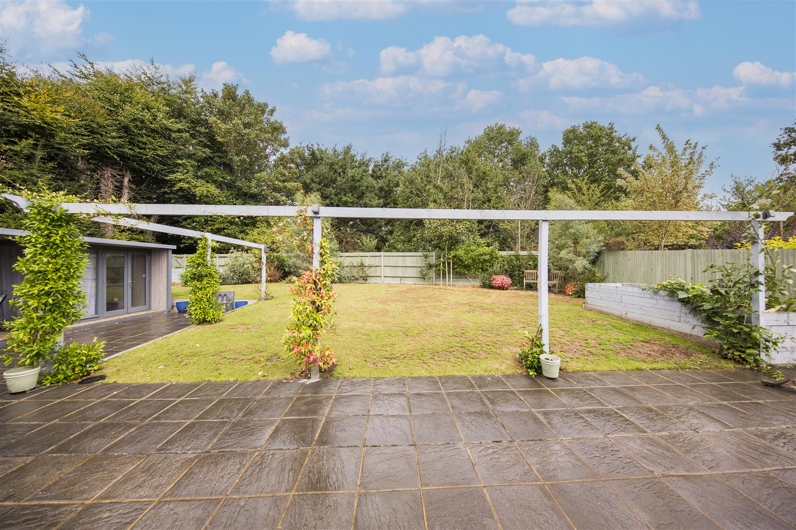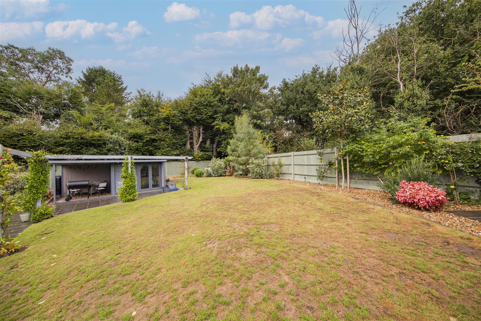 A beautifully landscaped rear garden offering a peaceful outdoor retreat. It features a large paved patio area that extends from the house, perfect for outdoor dining and entertaining. Beyond the patio, the garden opens to a generous lawn bordered with mature trees and shrubs, providing privacy and a natural backdrop. A contemporary garden room with large windows and a covered seating area stands at one end of the garden, ideal for relaxing or working in a tranquil setting.