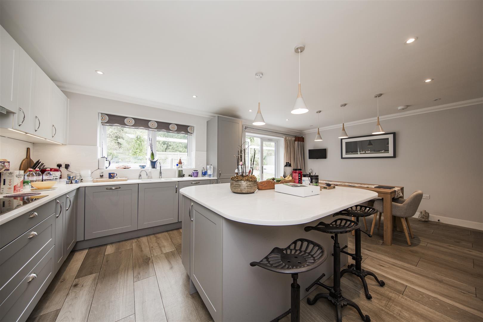 This generously sized kitchen diner offers a contemporary space for cooking and dining. It features an island with bar seating, integrated appliances including an oven and hob, and a window that lets in natural light. The room extends into a dining area with a large wooden table and chairs, and French doors open to the garden, creating a seamless flow between indoor and outdoor living. The underfloor heating adding warmth and continuity throughout the space.