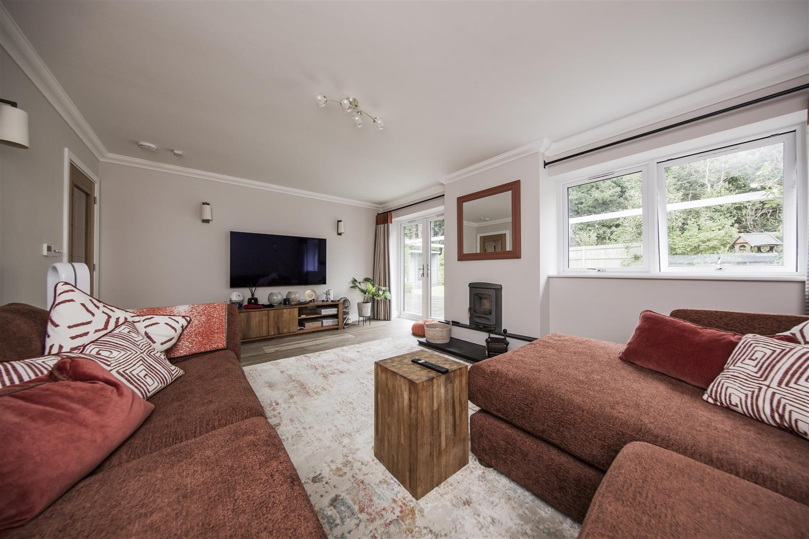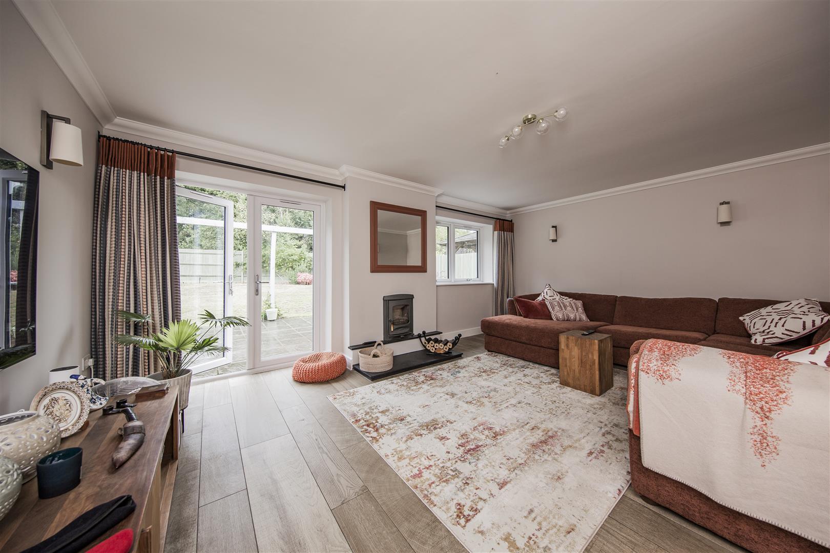 A comfortable sitting room designed to relax and entertain. It has large windows and French doors that lead out to the garden patio, filling the room with natural light. Neutral walls and wood-effect flooring create a calm and inviting atmosphere, complemented by a large corner sofa and a fireplace, giving the room a cosy feel.