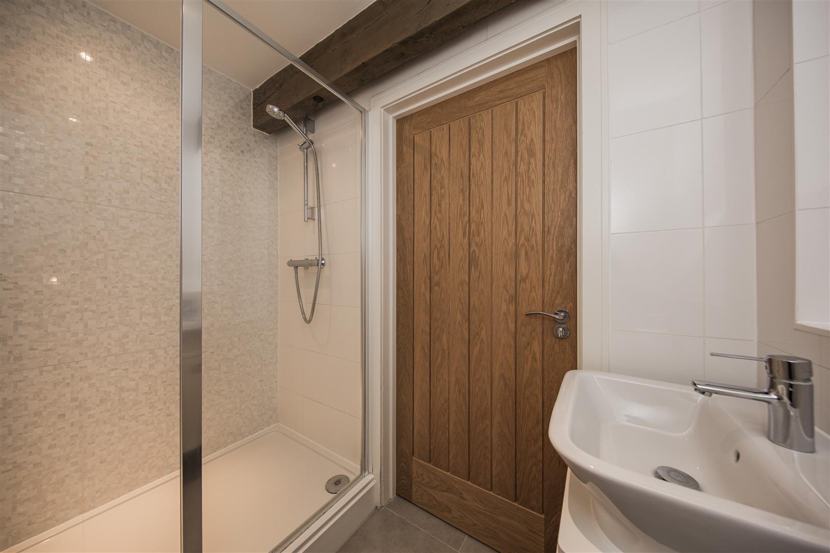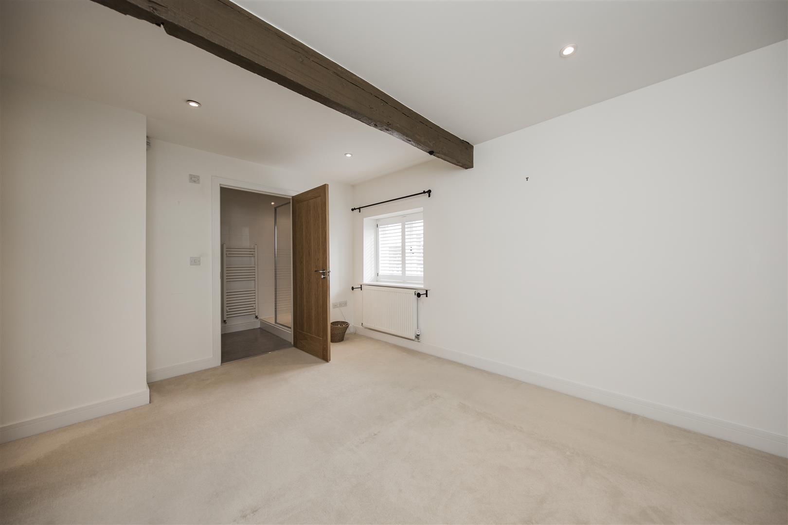 This bedroom is bright and spacious, featuring a neutral carpet and white walls complemented by exposed wooden beams on the ceiling, adding architectural interest. A good-sized window fitted with white shutters lets in natural light, and the room includes a wooden door leading to an en-suite shower room. The en-suite itself is modern with neutral tiling, a shower enclosure, and a compact washbasin with sleek fittings.