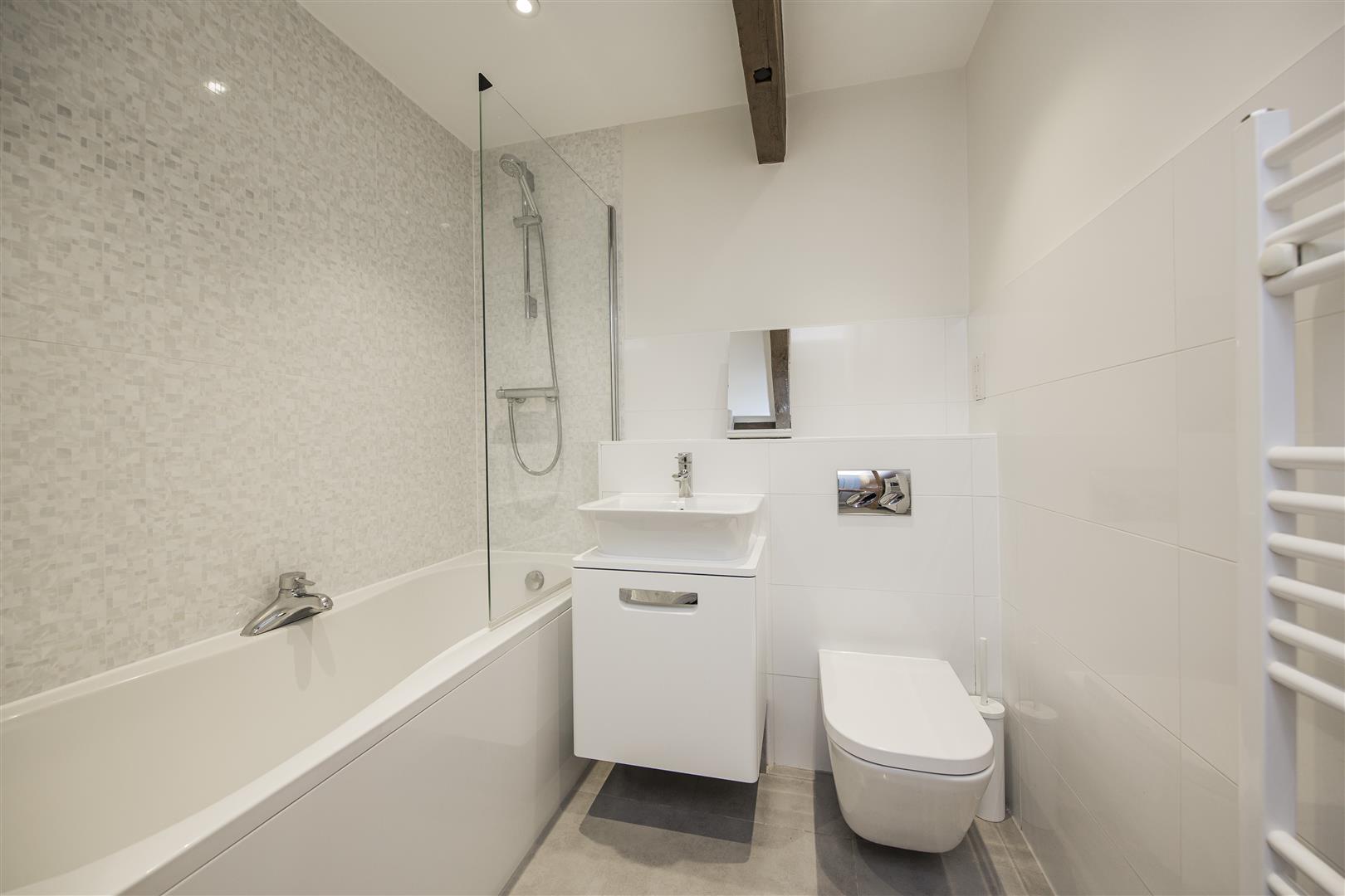 The main bathroom is contemporary and bright, decorated with light tiles and flooring that complements the clean white sanitaryware. It includes a bath with a screen, a compact basin with storage below, and a WC. Chrome fittings and a towel radiator add to the modern finish, while a window allows daylight to filter in.