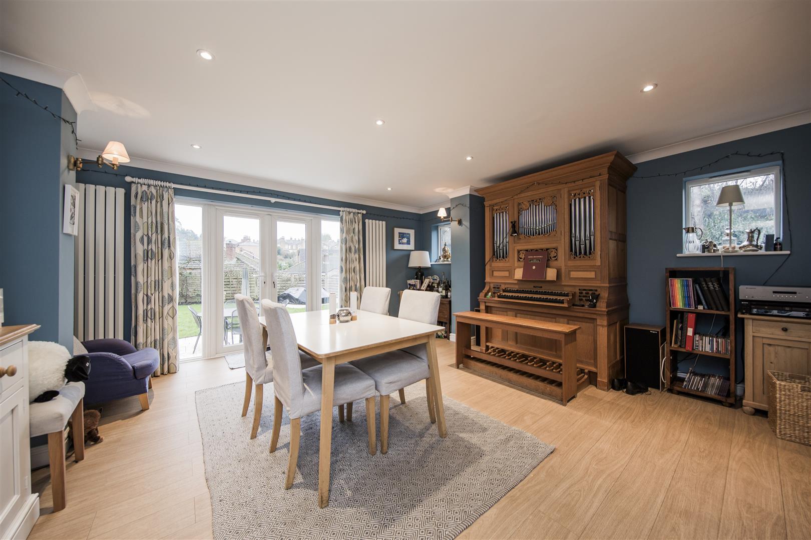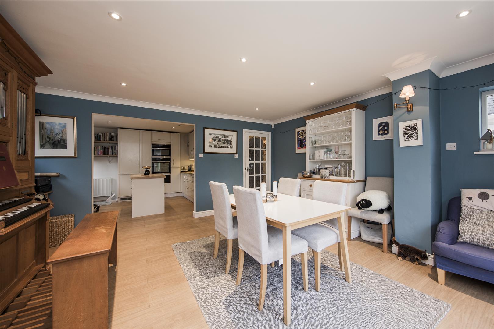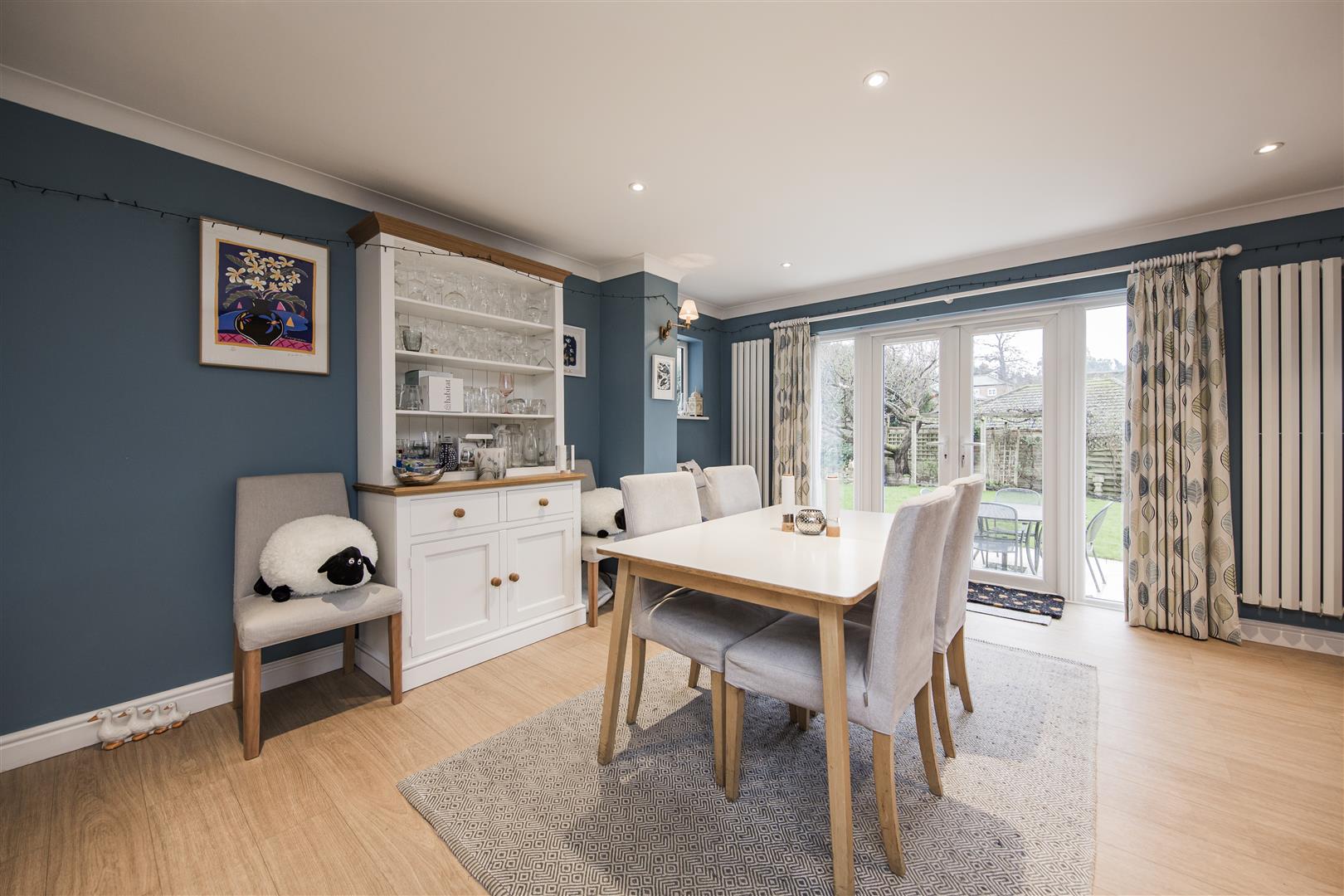Contemporary and well-appointed, the Kitchen features a practical layout with ample cupboard storage and integrated appliances including a dishwasher, oven, combination microwave / grill, warming drawer, induction hob, fridge freezer and integrated recycling bin. These are all set against a backdrop of light cabinetry and wood-effect worktops. A central island provides extra preparation space and storage, complementing the room’s light wood flooring and recessed ceiling lighting. The kitchen opens directly into the Dining Room, creating a sociable and functional space, with easy garden access through the French doors. It also offers access via a stable door to the side for easy access to the garage.