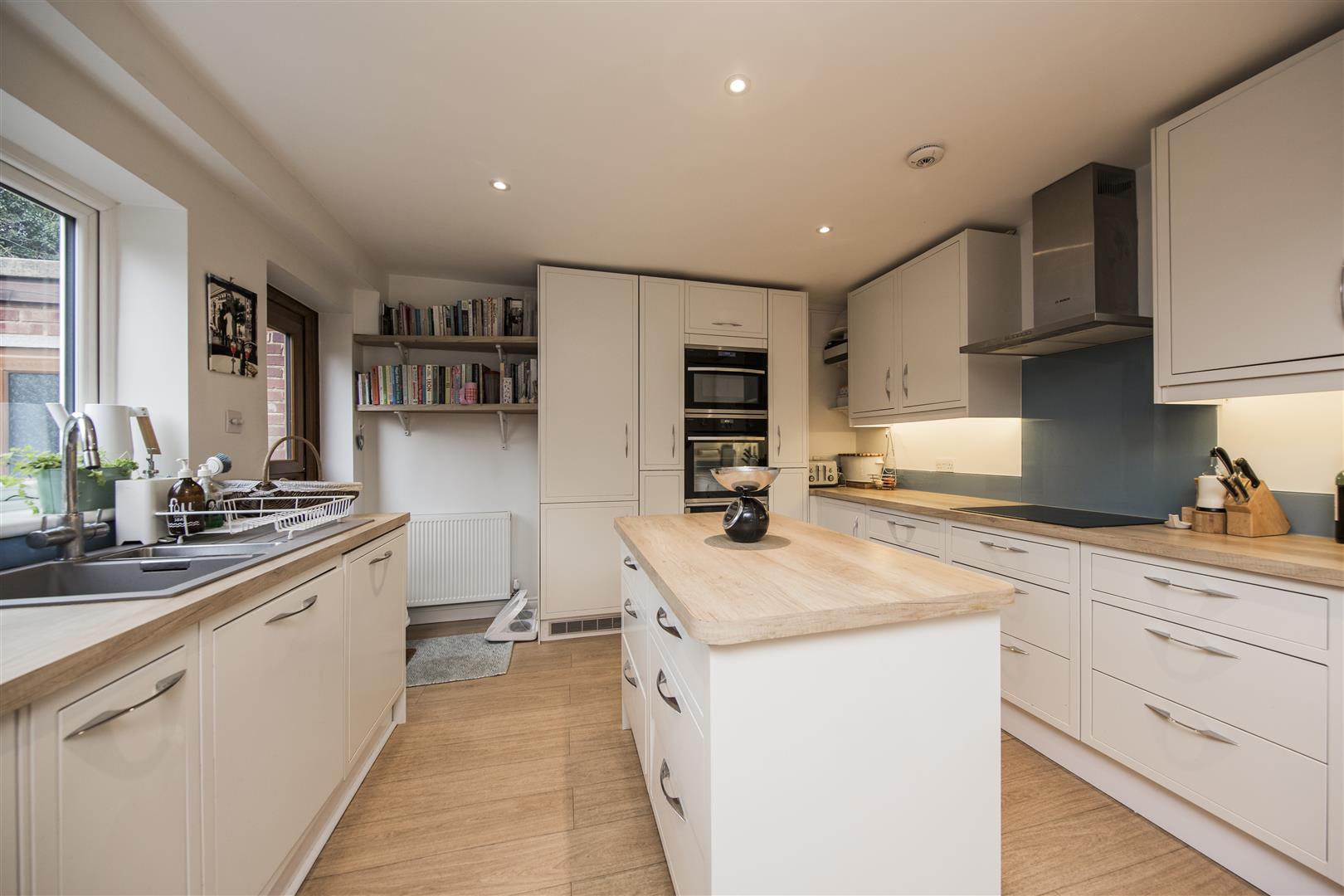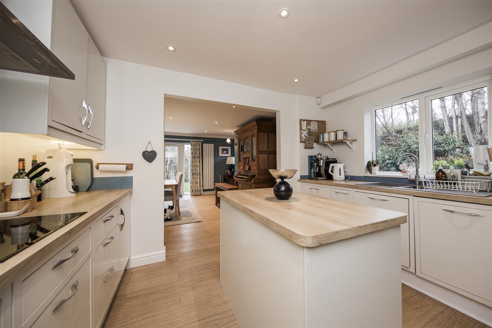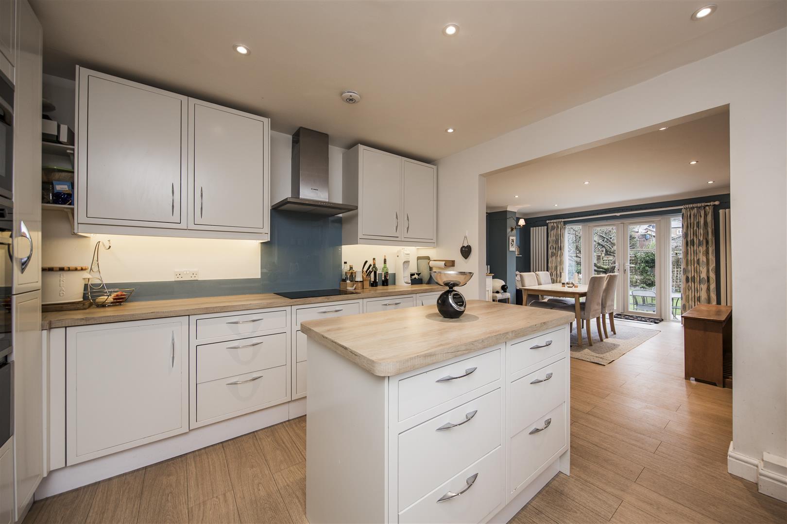 Contemporary and well-appointed, the Kitchen features a practical layout with ample cupboard storage and integrated appliances including a dishwasher, oven, combination microwave / grill, warming drawer, induction hob, fridge freezer and integrated recycling bin. These are all set against a backdrop of light cabinetry and wood-effect worktops. A central island provides extra preparation space and storage, complementing the room’s light wood flooring and recessed ceiling lighting. The kitchen opens directly into the Dining Room, creating a sociable and functional space, with easy garden access through the French doors. It also offers access via a stable door to the side for easy access to the garage.
