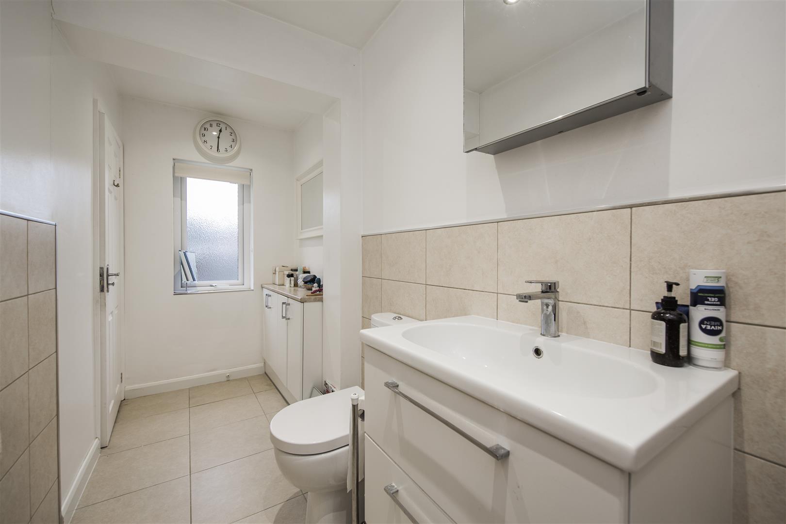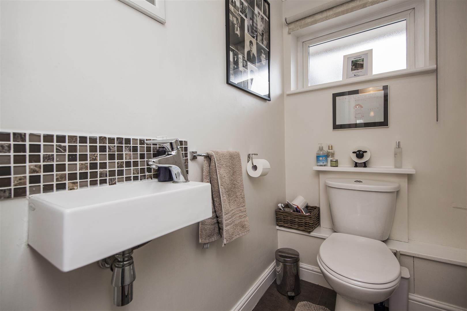 The ground floor WC features a modern, compact suite with a floating sink and toilet set against a tiled splashback. A small window provides natural light, with neutral décor enhancing the fresh and clean feel of the space.