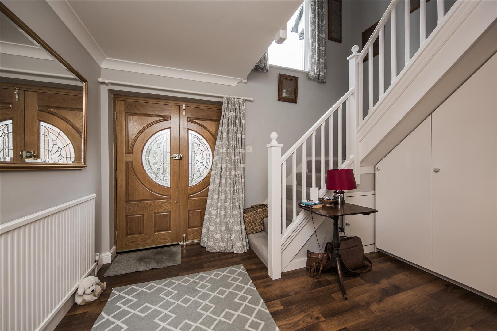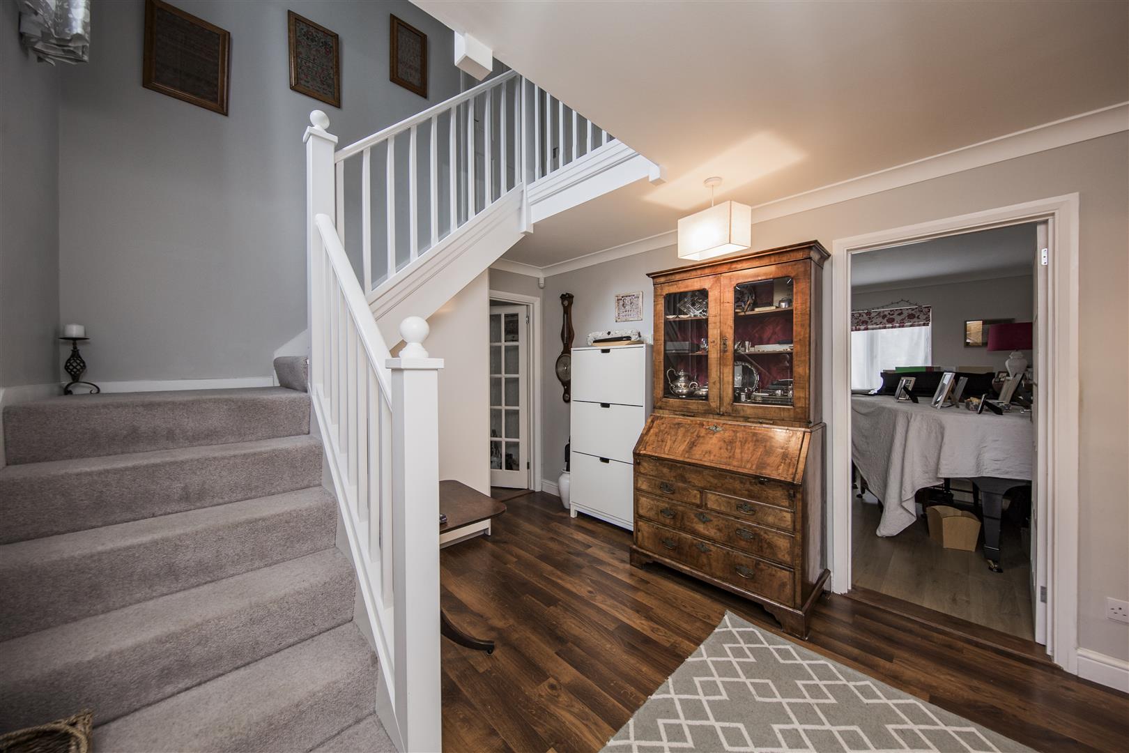 The spacious and welcoming Entrance Hall boasts rich wooden effect flooring and a charming staircase leading to the first floor. Its neutral walls and classic décor provide a warm welcome, with space for furniture and coat hanging cupboard under the stairs, creating a functional yet inviting entry point to the home.