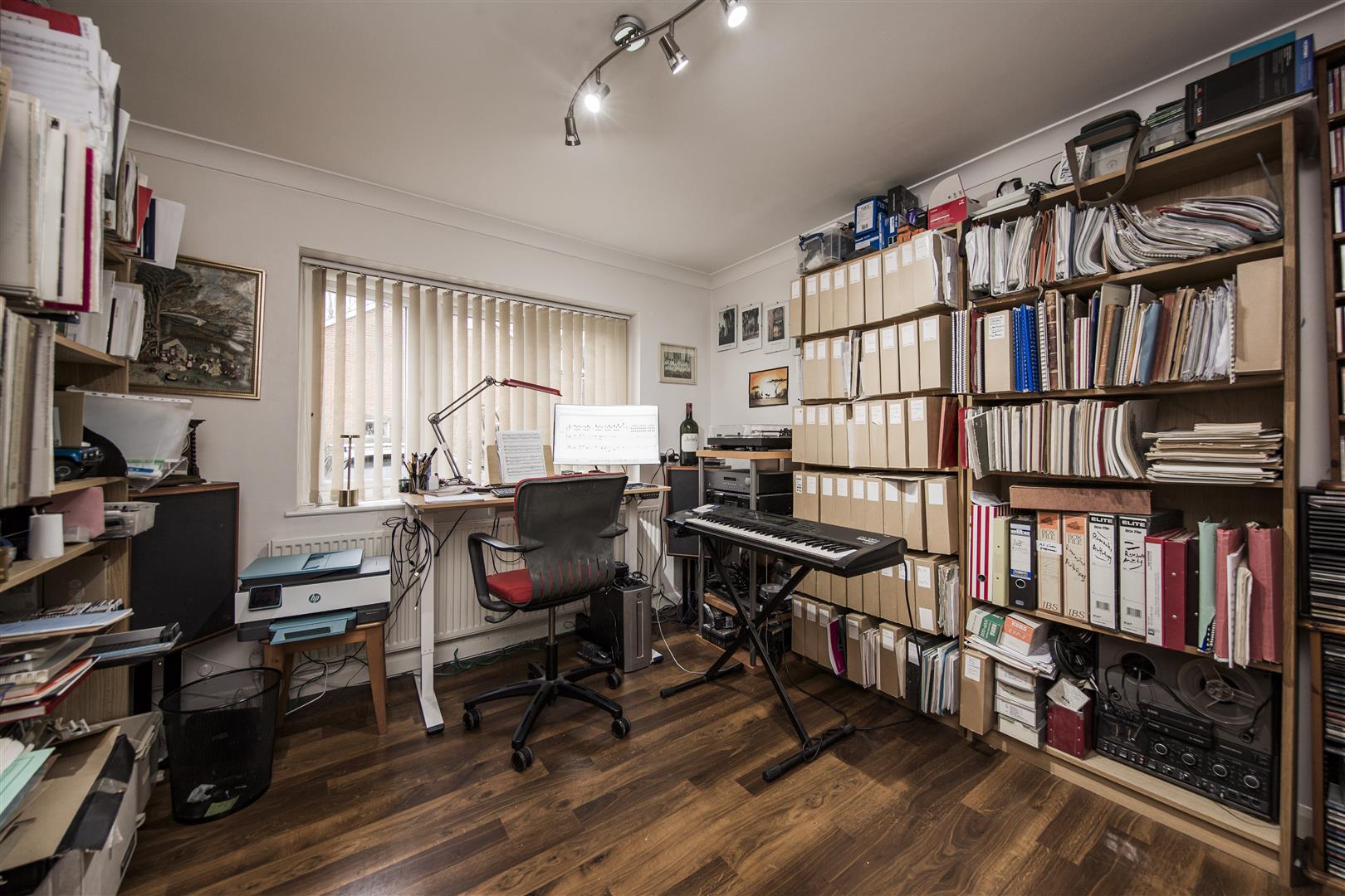The study is a versatile space benefiting from natural light through a generous window overlooking the front of the property. It is currently arranged as a home office and music area, currently set up with plenty of shelving and space for seating or desks, making it ideal for working from home or pursuing creative hobbies.