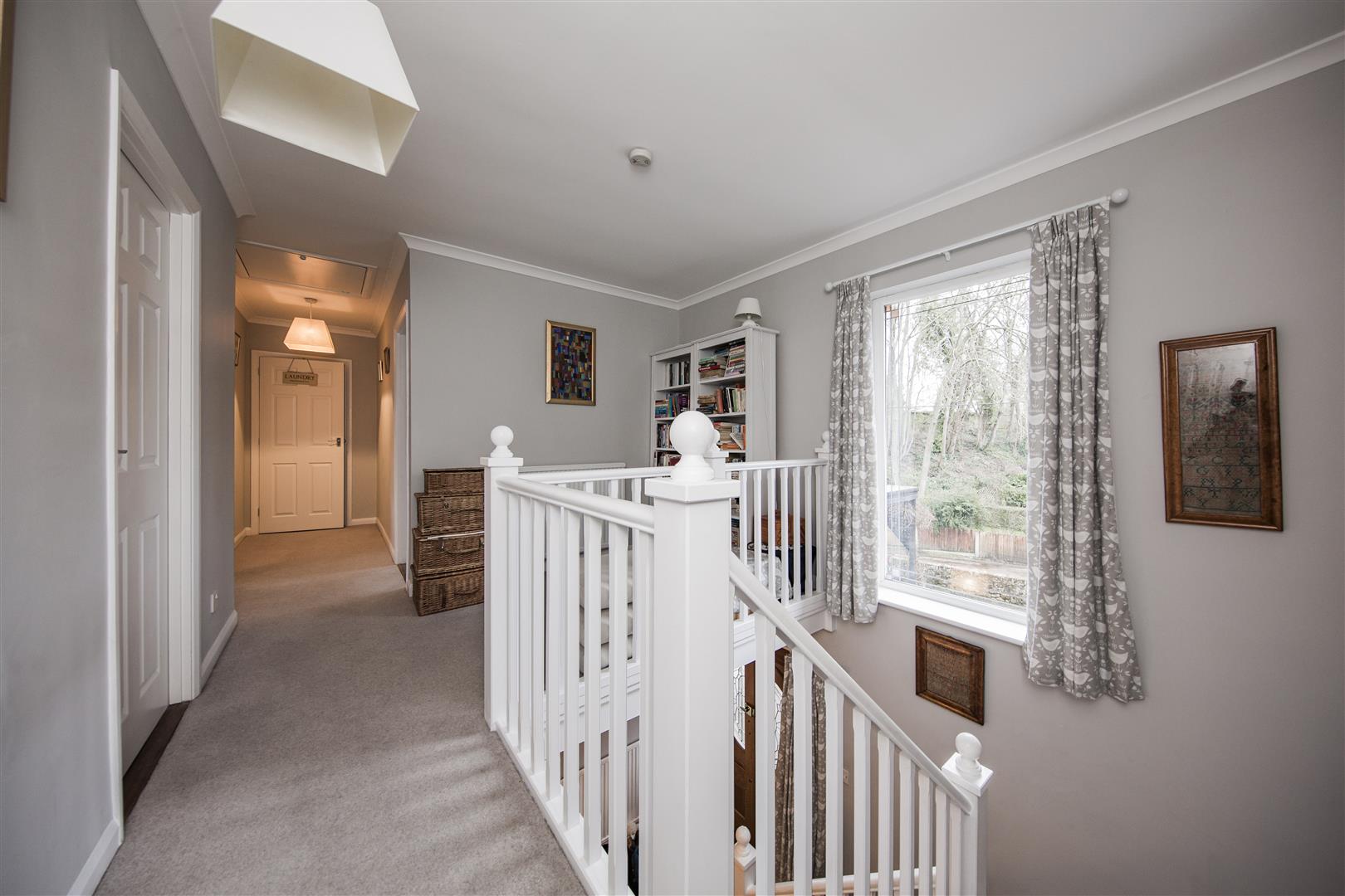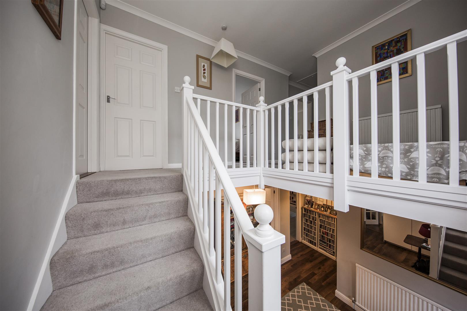 The Landing on the first floor is bright and airy, with a light grey carpet underfoot and a window to the side. It offers access to all bedrooms and the family bathroom and features a balustrade enclosing the stairwell, adding to the open, spacious feel of the upper level. It is spacious enough to be set up for an additional study area.