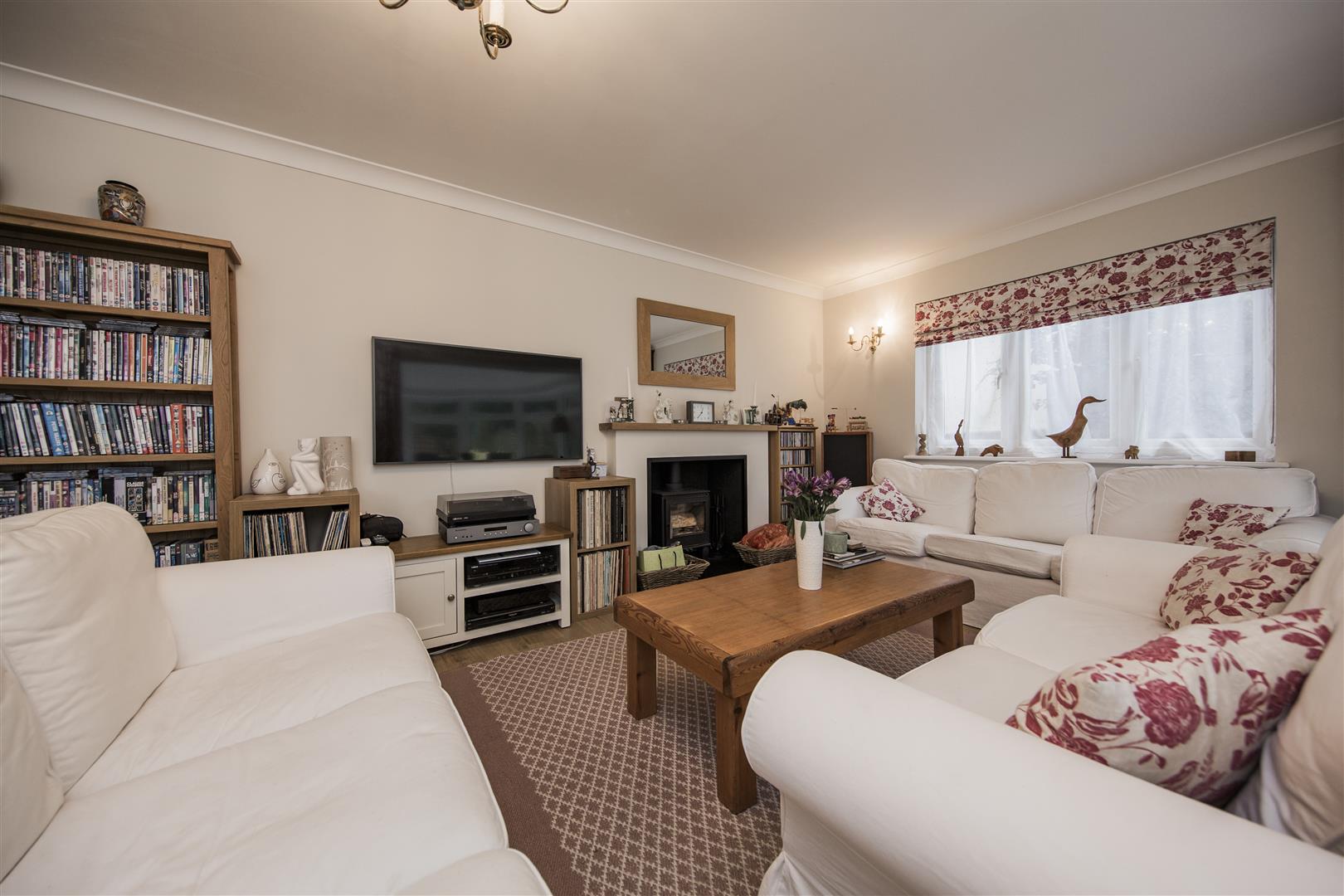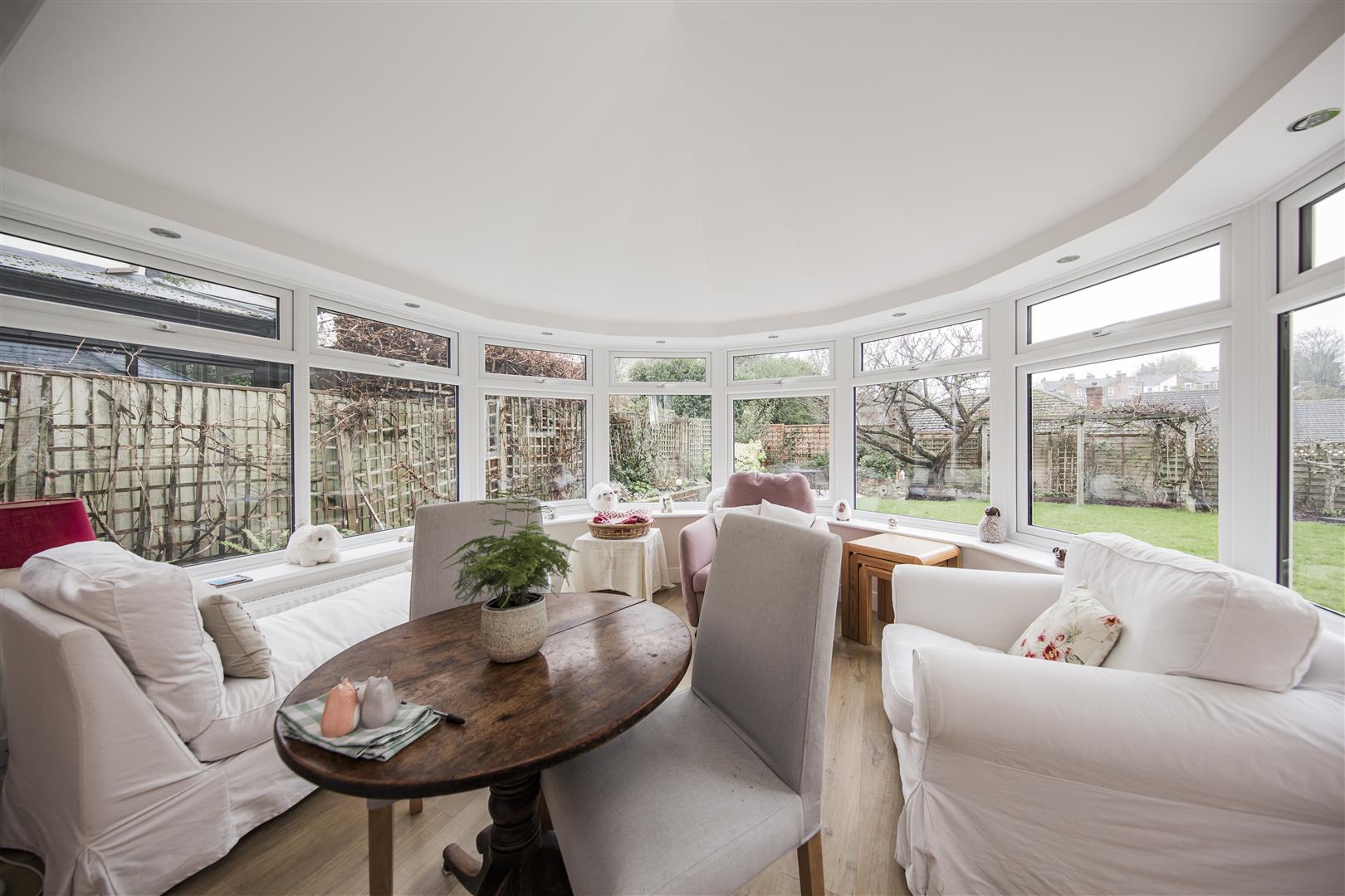 The inviting Sitting Room features generous proportions and is bathed in natural light from dual aspect windows. A central fireplace with a wood-burning stove forms a cosy focal point, complemented by comfortable seating arranged around a wooden coffee table. The room’s neutral walls and warm wood-effect flooring create a welcoming and relaxed atmosphere, perfect for unwinding or entertaining guests. The space flows seamlessly into the adjoining Sun Room, expanding the living area with its bright, curved windows, insulated roof and door to the garden. Offering panoramic garden views, a peaceful spot to enjoy the outdoors from within.
