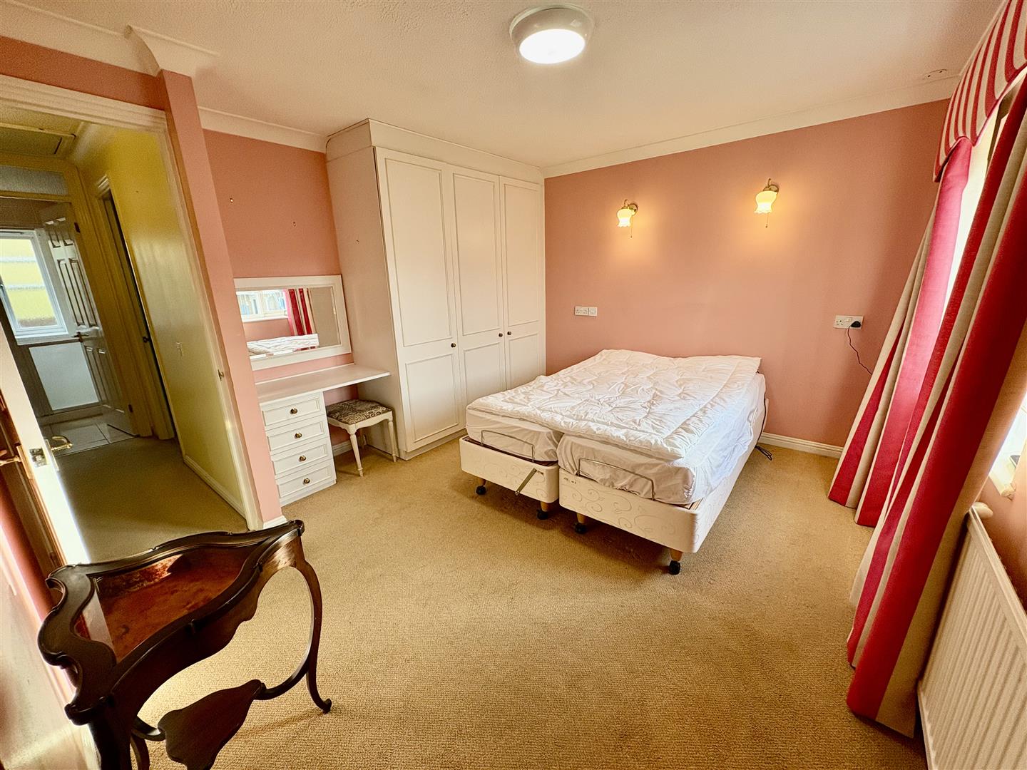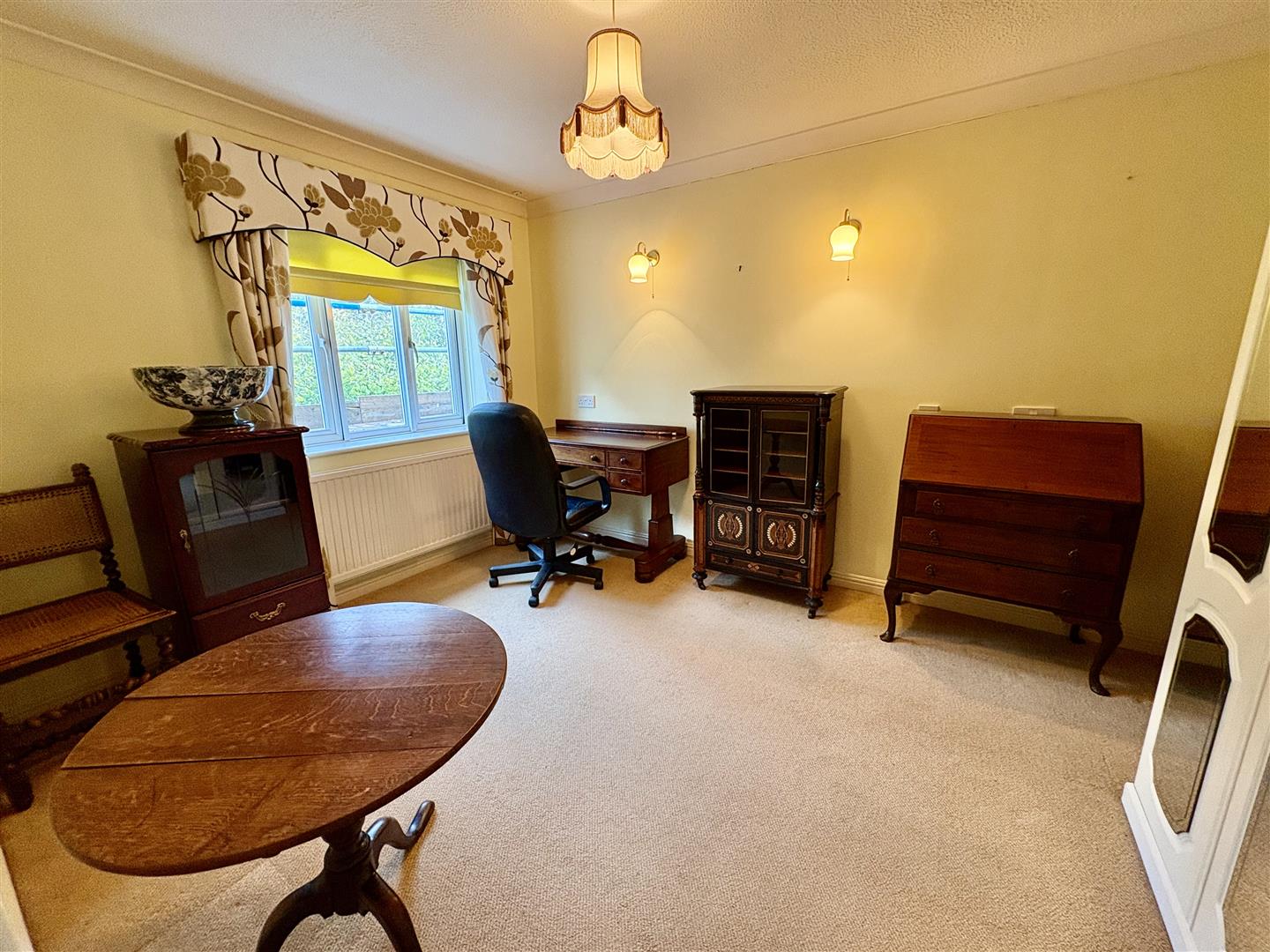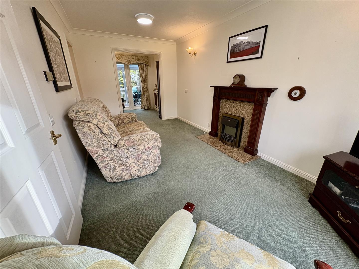 The lounge is a bright and inviting space with a large window overlooking the front central green. It benefits from a traditional-style fireplace with a decorative surround, providing a cosy focal point. The room has neutral carpeting and light walls, offering plenty of room for seating and entertaining.